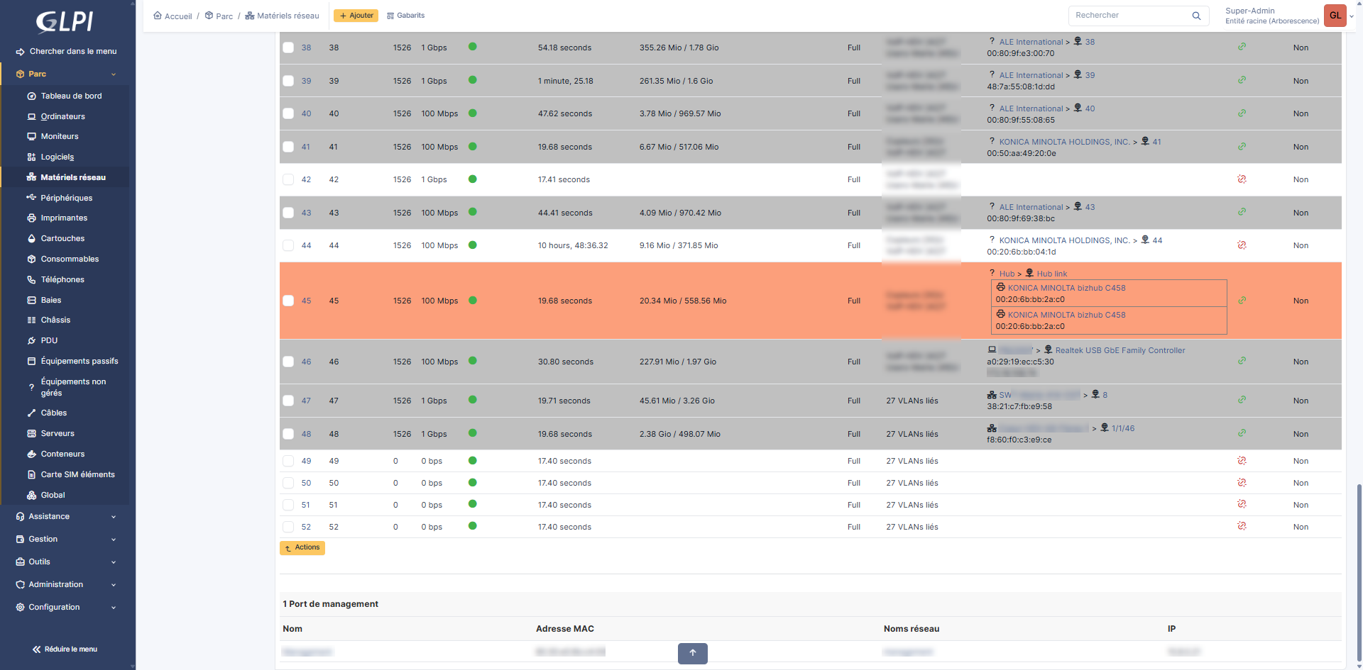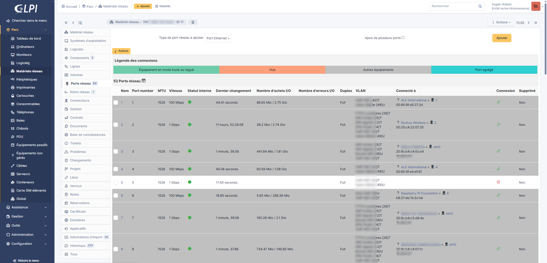 Pour les switchs, le plus intéressent se trouve au niveau des ports, car vous allez avoir pleins d’information, comme les VLAN, la vitesse du ports et les équipements connectés.