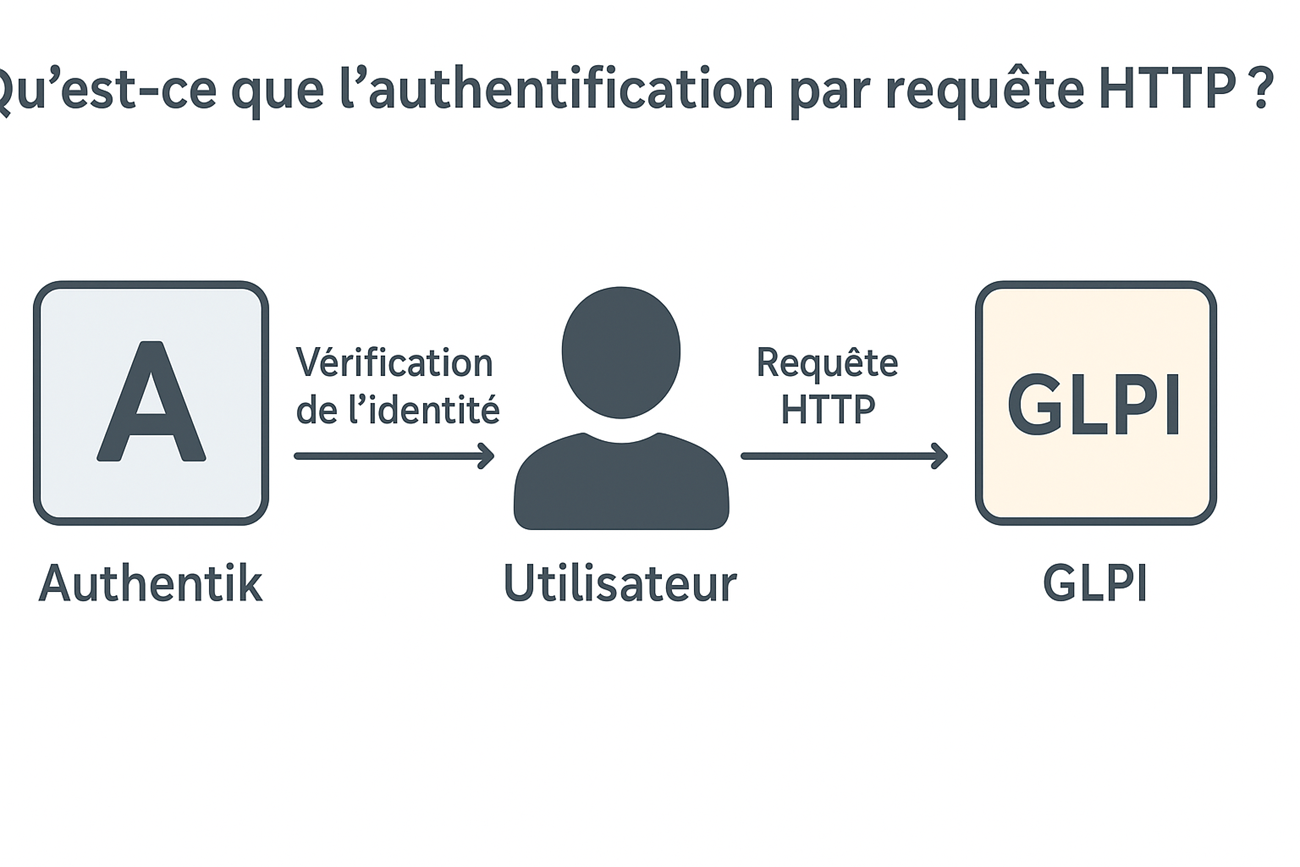 L’authentification par requête HTTP est un mécanisme qui permet à une application de déléguer la gestion de l’identité des utilisateurs à un service externe. Concrètement, lorsqu’un utilisateur tente d’accéder à une application comme GLPI, il est d’abord authentifié par un service tiers (ici Authentik). Une fois l’identité vérifiée, les informations de l’utilisateur (par exemple son login ou son adresse e-mail) sont transmises à l’application cible via un en-tête HTTP.