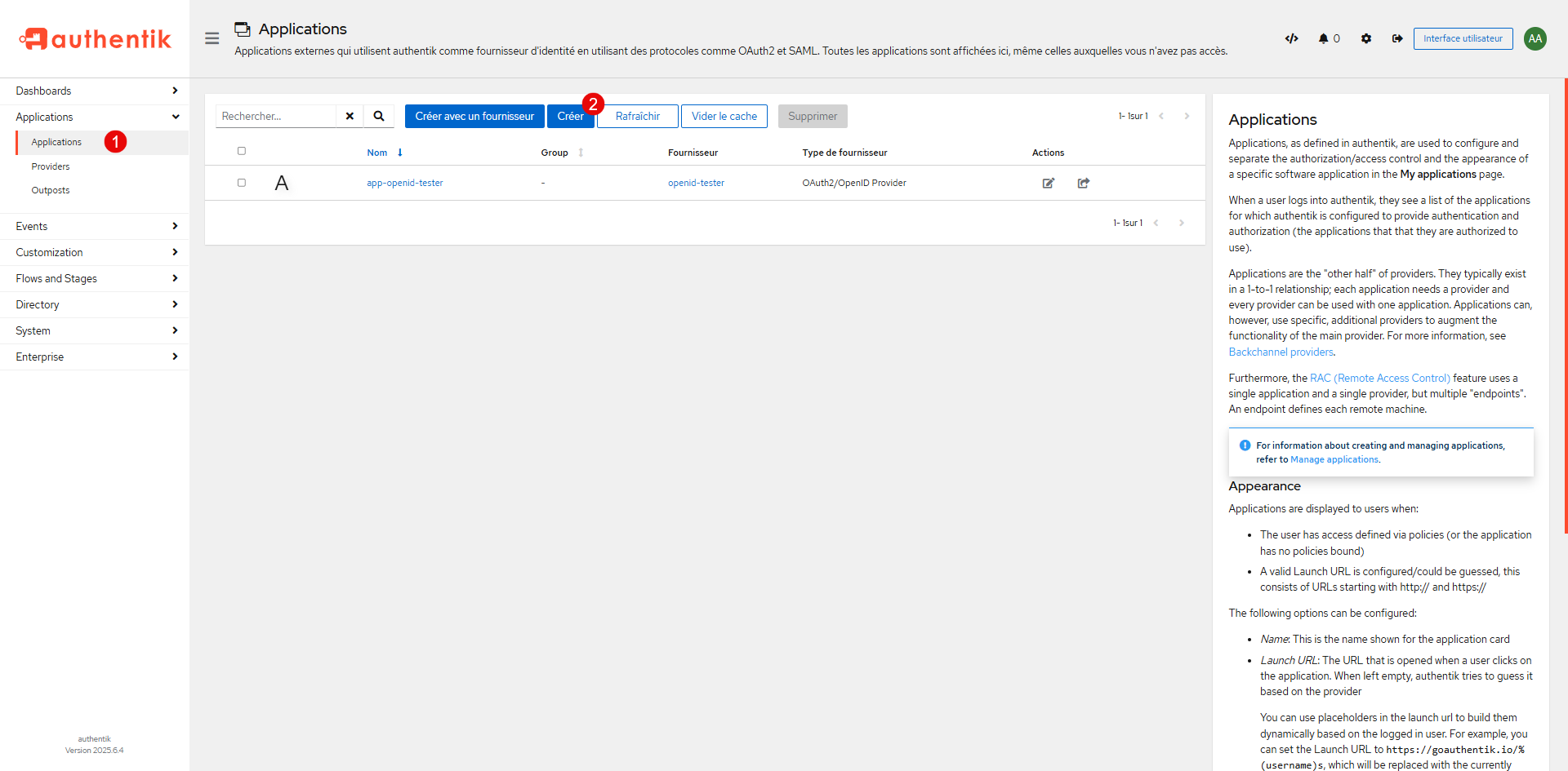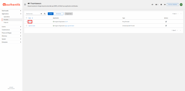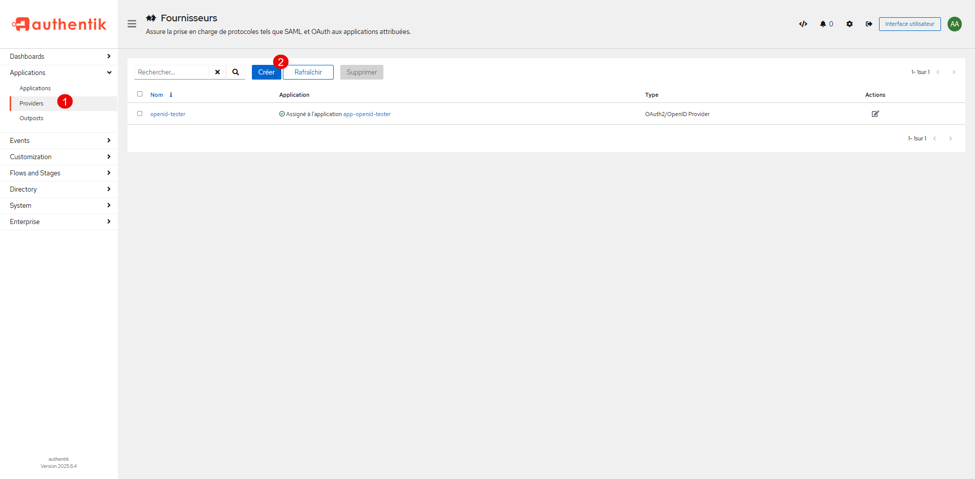 Dans le menu Applications, cliquer sur le Provider 1 puis cliquer sur Créer 2.