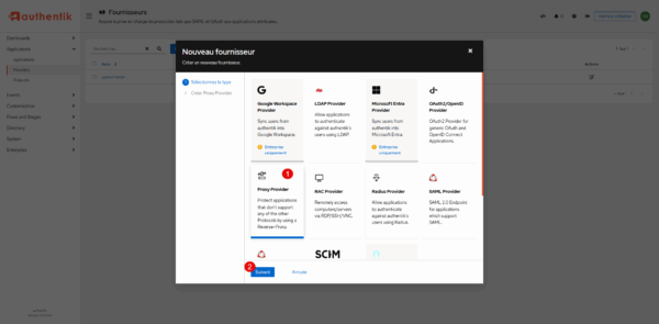 Dans la liste des fournisseurs, cliquer sur Proxy Provider 1 puis sur le bouton Suivant 2.