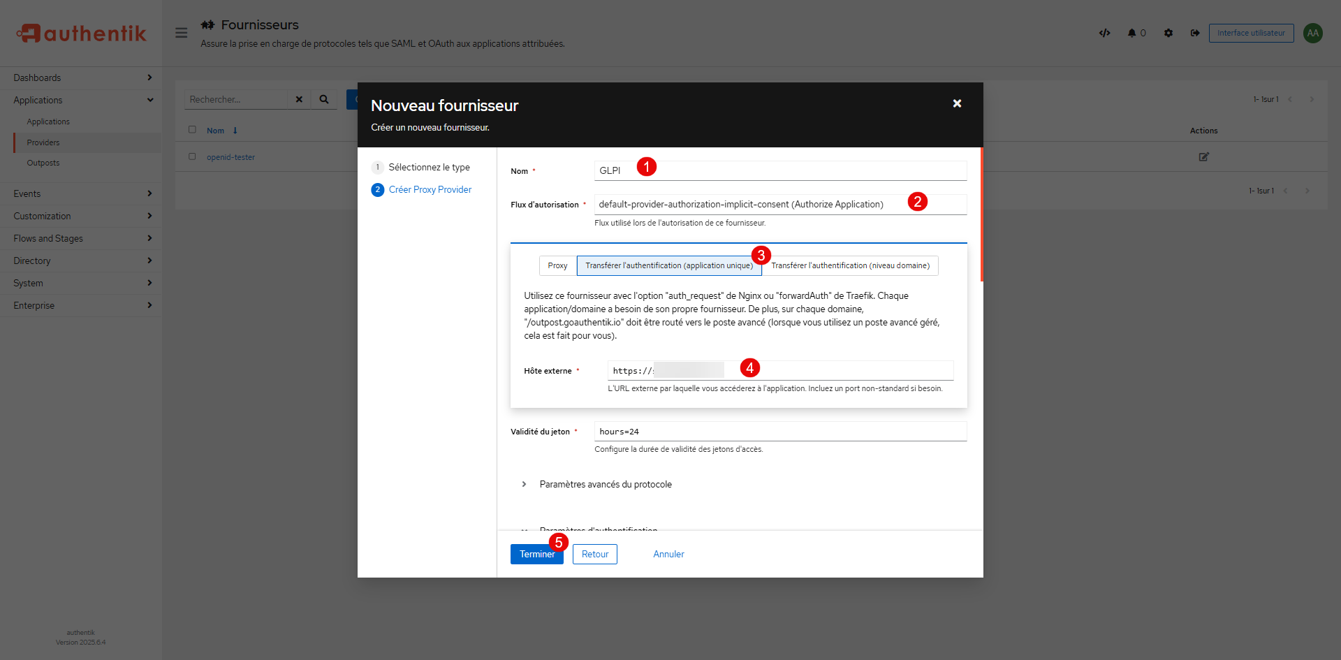 Nommer le fournisseur 1, sélectionner le flux d’authentification 2, dans le type, sélectionner Transférer l’authentification (application unique) 3 puis entrer l’URL de GLPI 4 et cliquer sur le bouton Terminer 5.