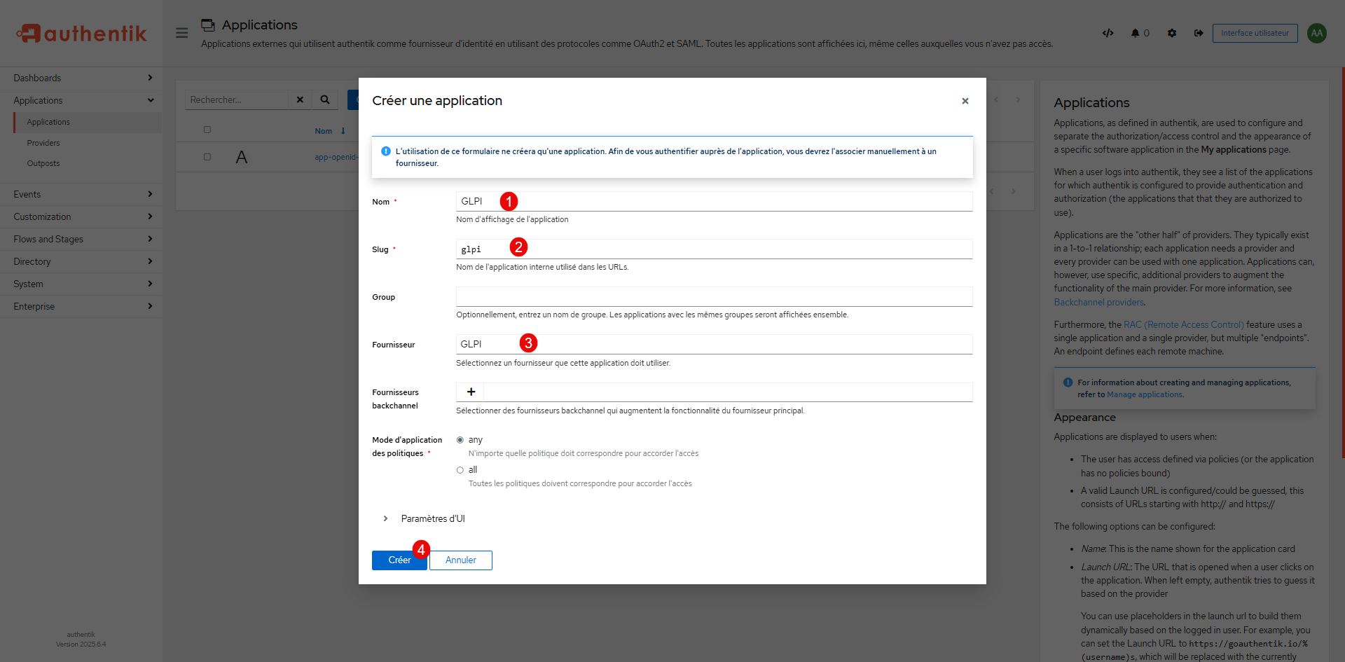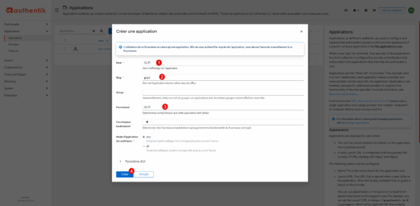 Nommer l’application 1 et entrer le slug 2 si celui-ci n’est pas généré automatiquement, dans le fournisseur sélectionner GLPI 3 qui a été créé précédemment et cliquer sur le bouton Créer 4.