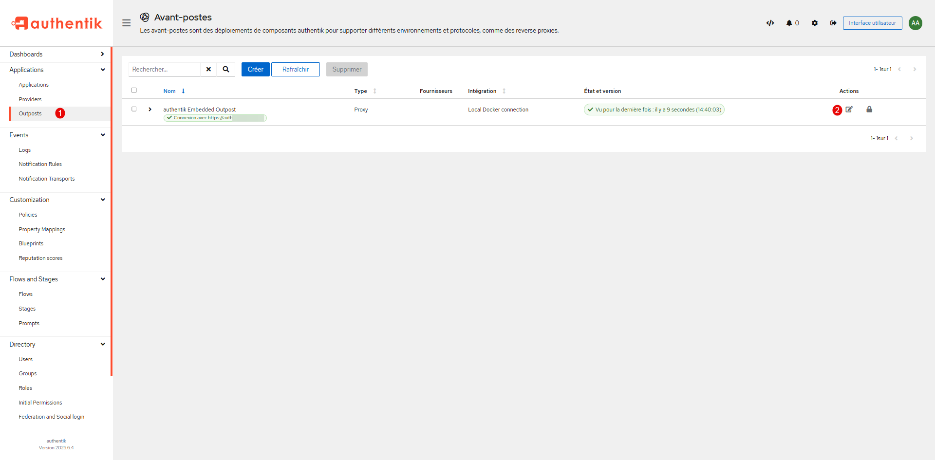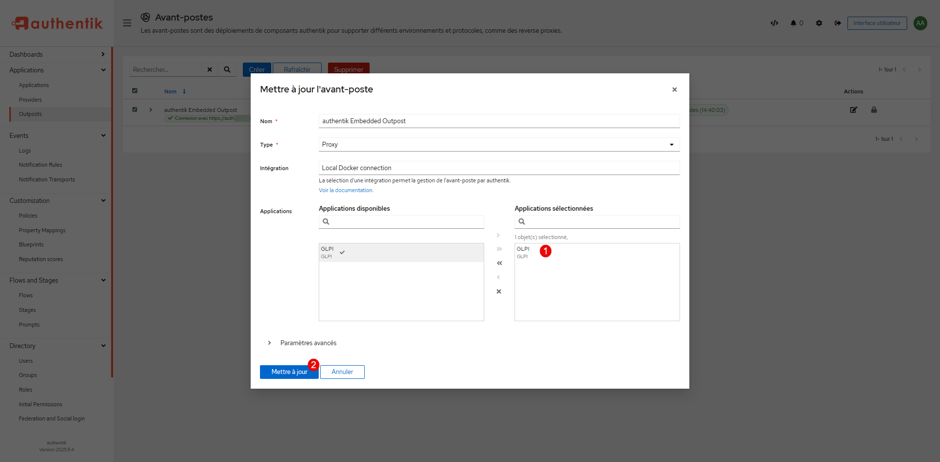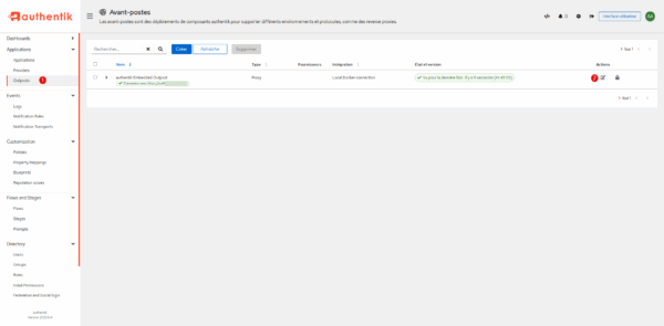 Publier le fournisseur GLPI sur l’Avant-Post (Outpost) d’Authentik, depuis le menu Application, cliquer sur Outposts 1 puis sur le bouton d’édition de ; authentik Embedded Outpost 2.