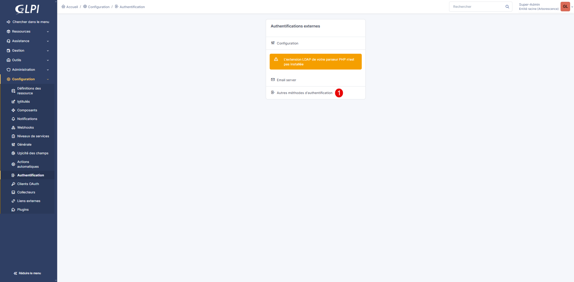 Depuis le menu, aller sur Configuration / Authentification et cliquer sur Autres méthodes d’authentification 1.