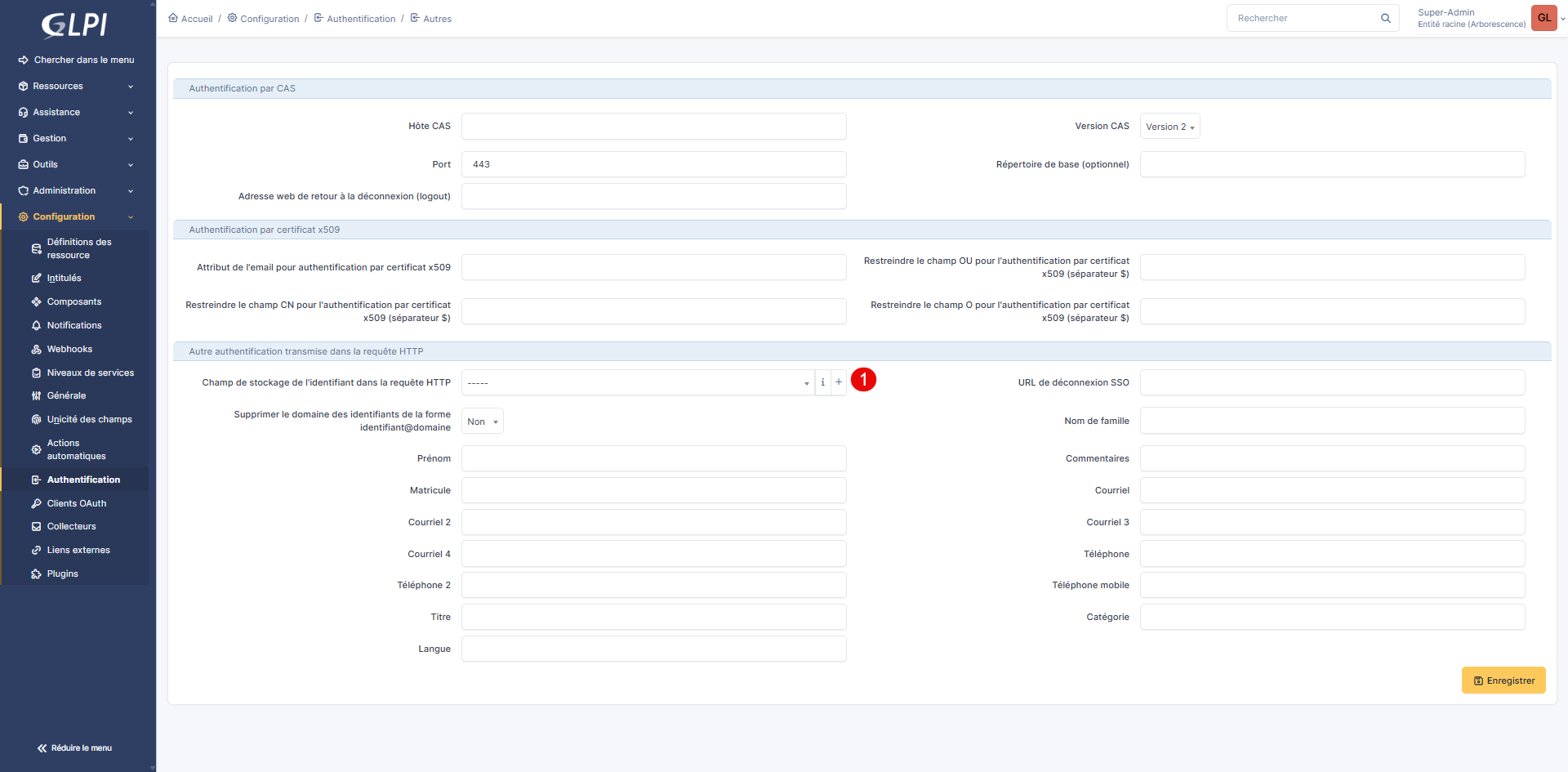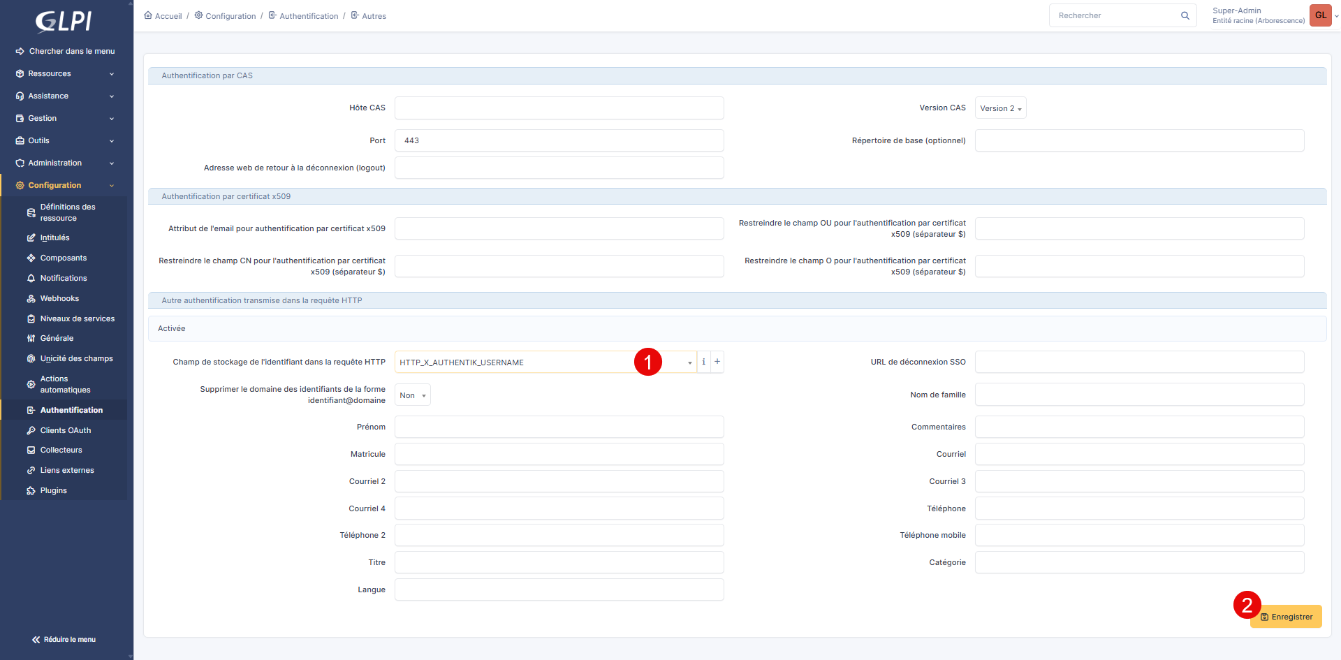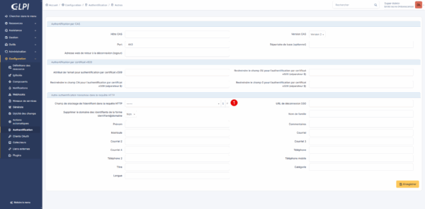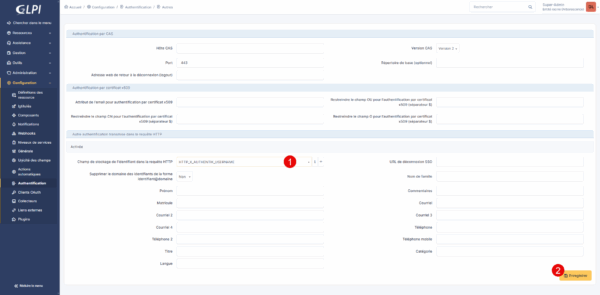 Ensuite dans GLPI, sélectionner la variable que l’on vient de créer 1 dans le champ : Champ de stockage de l’identifiant dans la requête HTTP et cliquer sur Enregistrer 2.