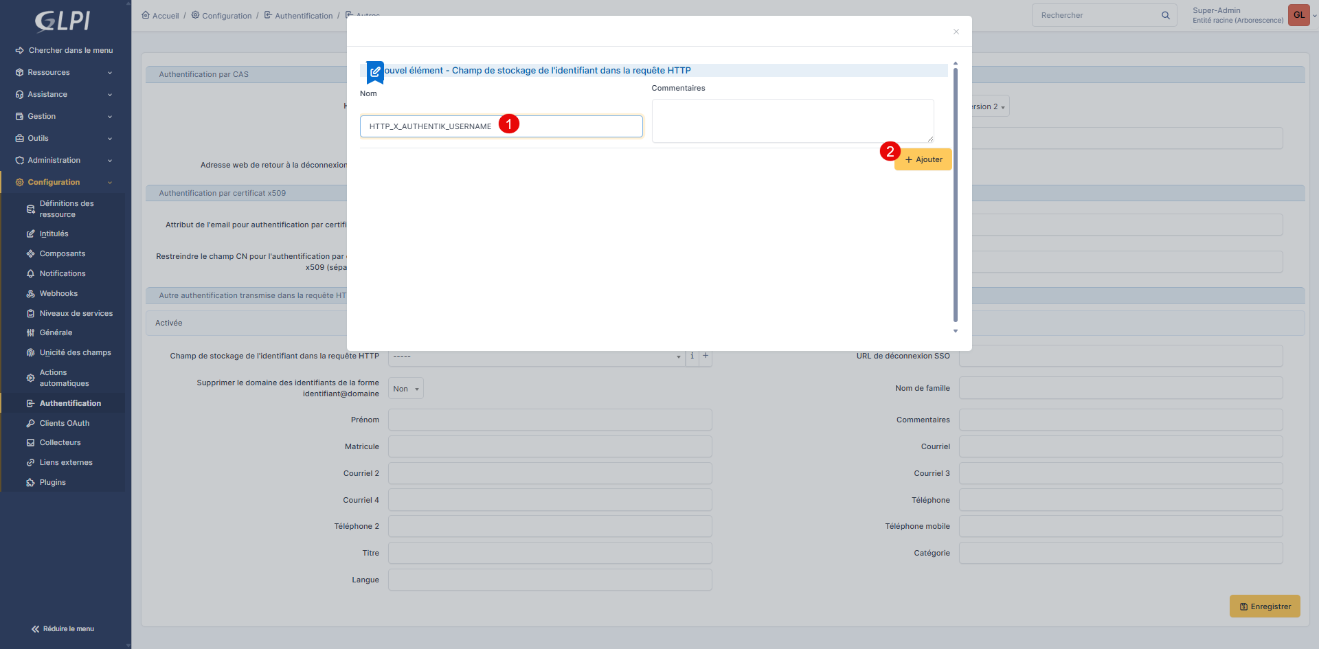 Entrer le nom de la variable qui est : HTTP_X_AUTHENTIK_USERNAME 1 puis cliquer sur Ajouter 2.