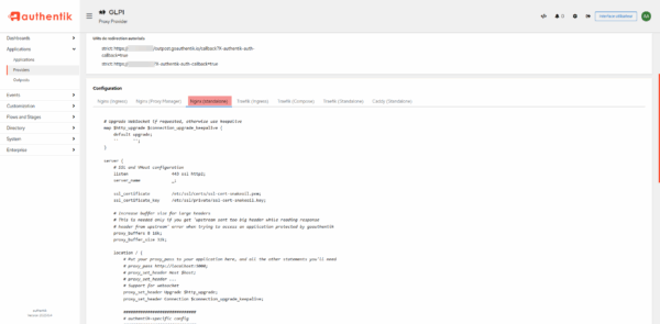 Pour finir, nous allons passer à la configuration du Nginx qui est le reverse proxy pour l’accès à GLPI et à Authentik.