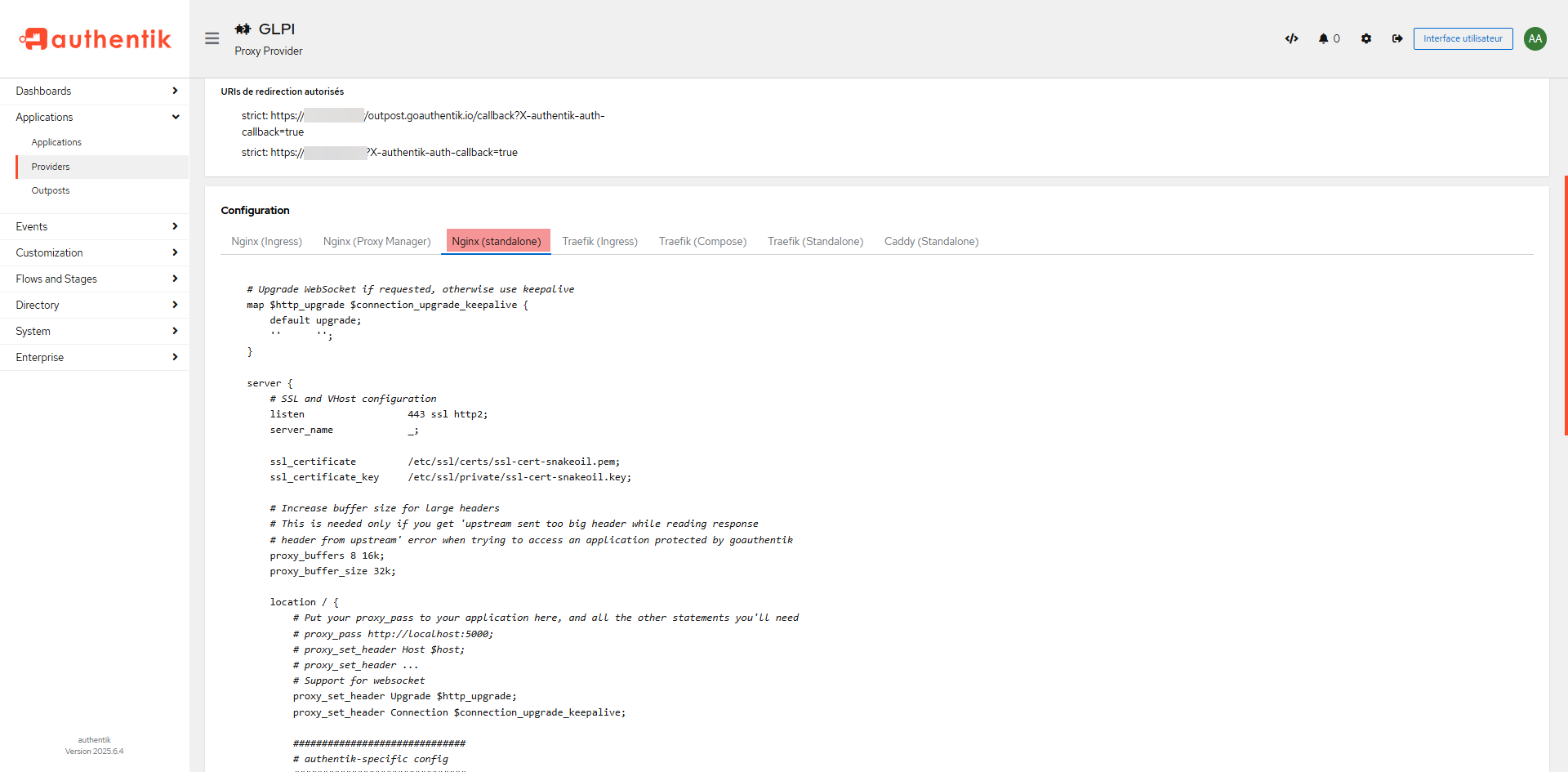 sudo cp vh-glpi vh-glpi.BACKUPPour nous aider à configurer le virtualhost, Authentik nous fournie la configuration à mettre en place, pour cela dans la liste des Provider, cliquer sur celui-ci qui sert à GLPI.