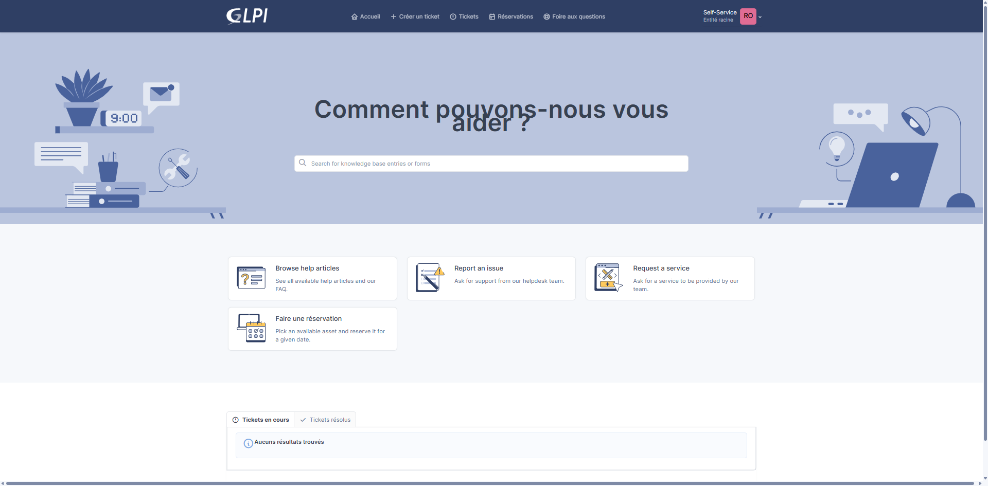 Si tout est bon, je suis connecté à GLPI et j’ai accès au portail utilisateur.