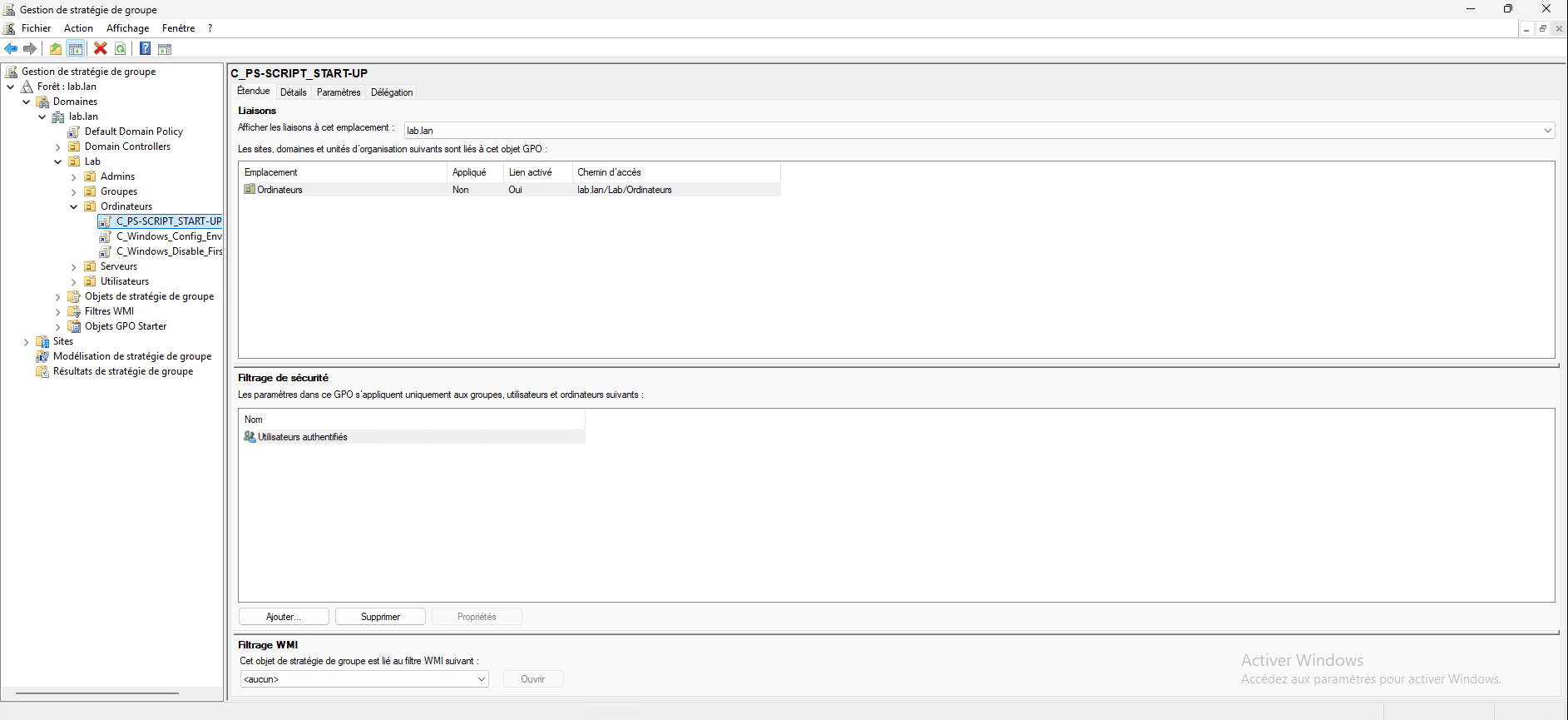 Pour illustrer ce tutoriel, je vais partir de la stratégie de groupe ci-dessous, C_PS-SCRIPT_START-UP, comment on peut le voir, elle est liée à l’OU ordinateur et appliquer sans restriction (Utilisateurs authentifiés).