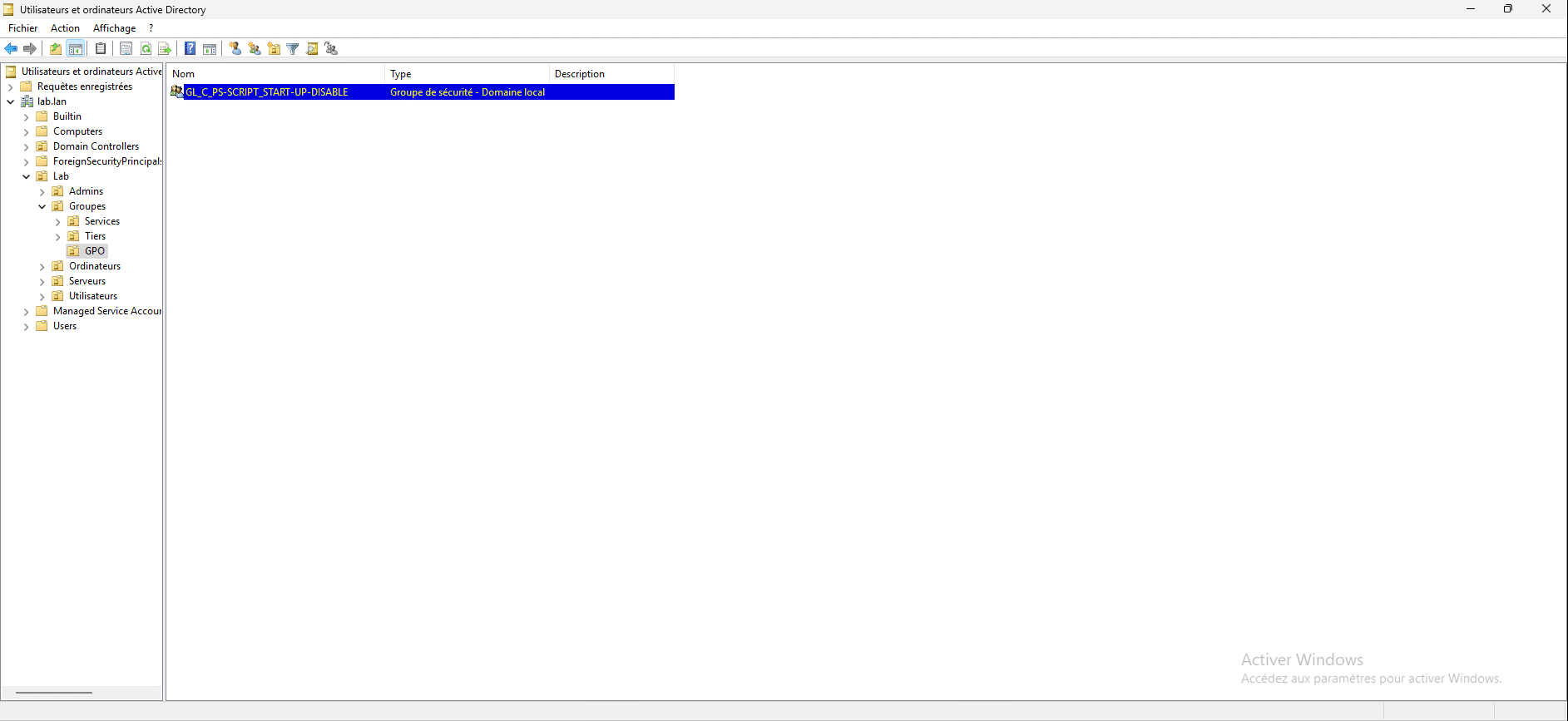 Pour commencer, il faut créer un groupe dans l’annuaire Active Directory, pour cela j’ai créé un groupe GL_C_PS-SCRIPT_START-UP-DISABLE, qui va contenir les ordinateurs que je souhaite exclure de l’application de la GPO.
