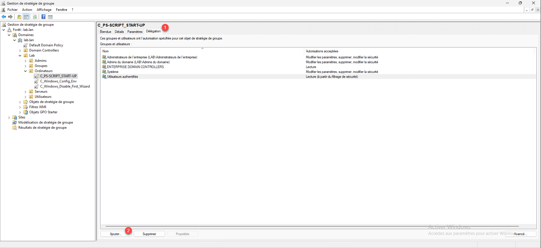 De retour sur la stratégie de groupe, aller sur l’onglet Délégation 1 puis cliquer sur le bouton Ajouter 2.