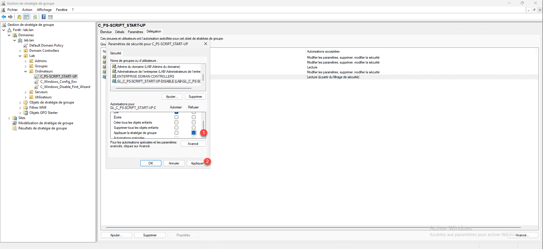 Maintenant dans les autorisations, cocher la case de refus pour Appliquer la stratégie de groupe 1 puis cliquer sur le bouton Appliquer 2.