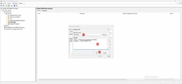 Sélectionner la stratégie de groupe 1 où vous souhaitez mettre le filtre et sélectionner le filtre WMI 2 dans la section Filtrage WMI.