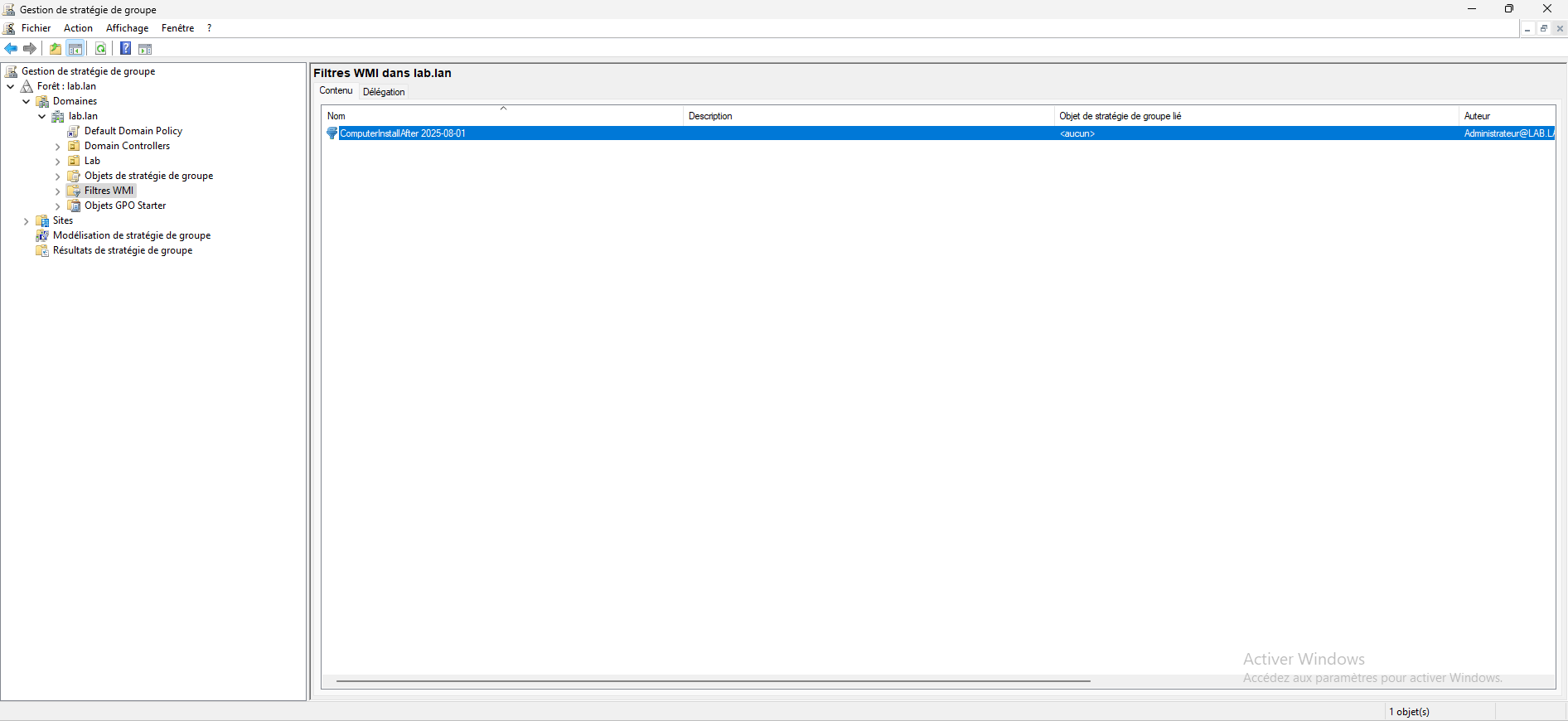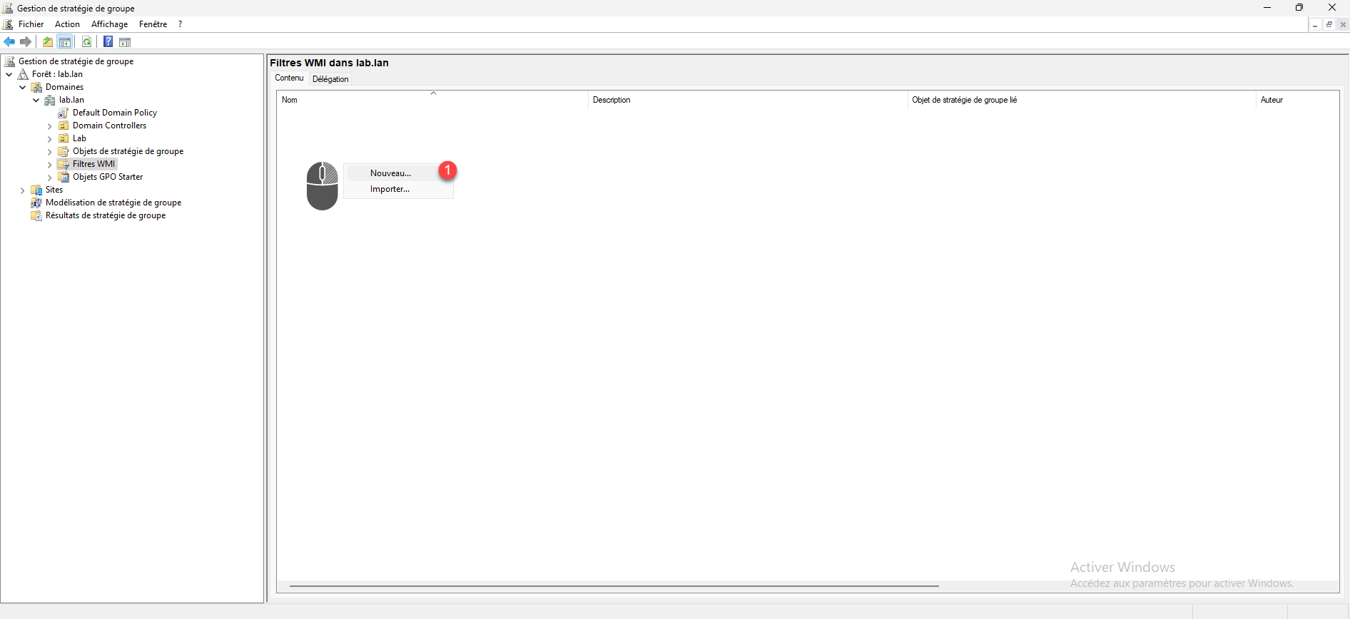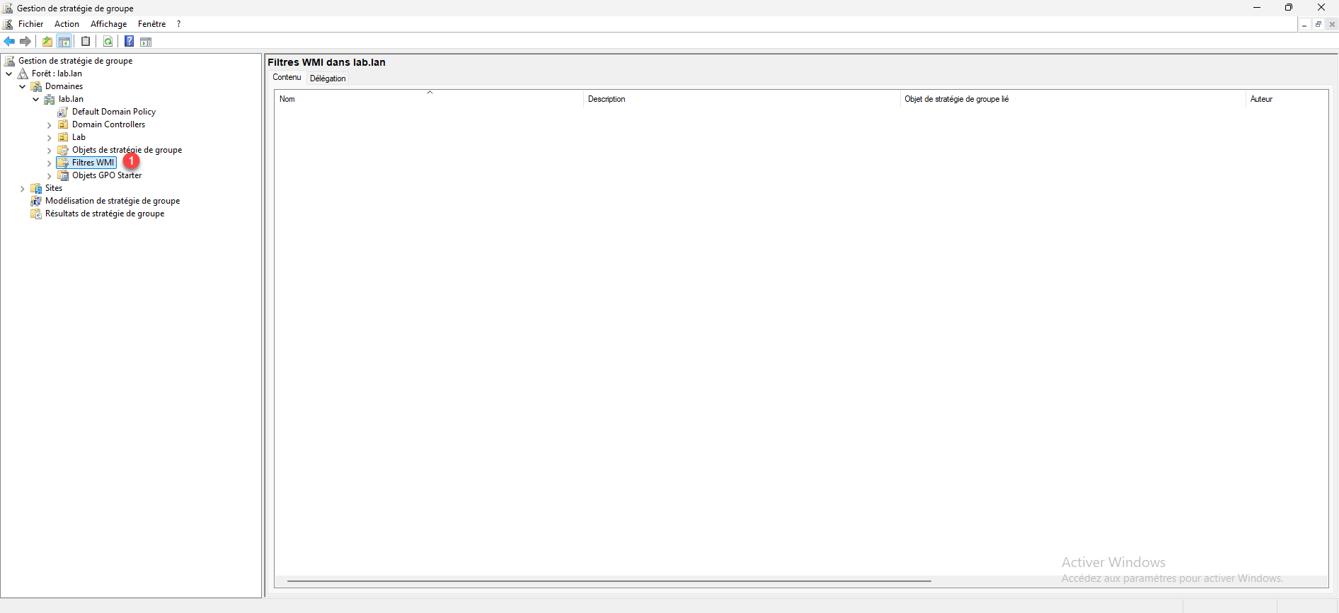 Depuis la console Gestion de stratégie de groupe, aller sur le dossier Filtre WMI 1.