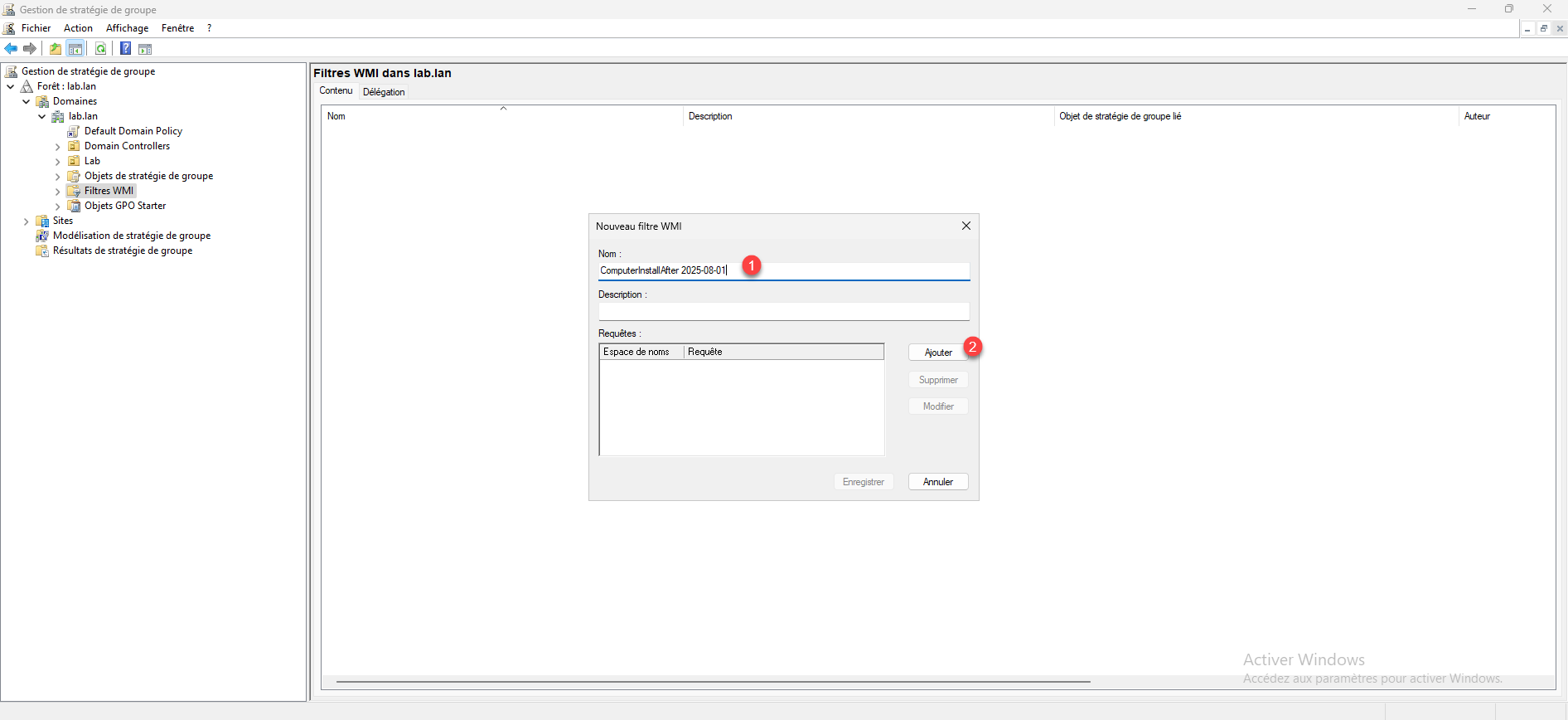 Nommer le filtre WMI 1 puis cliquer sur le bouton Ajouter 2.