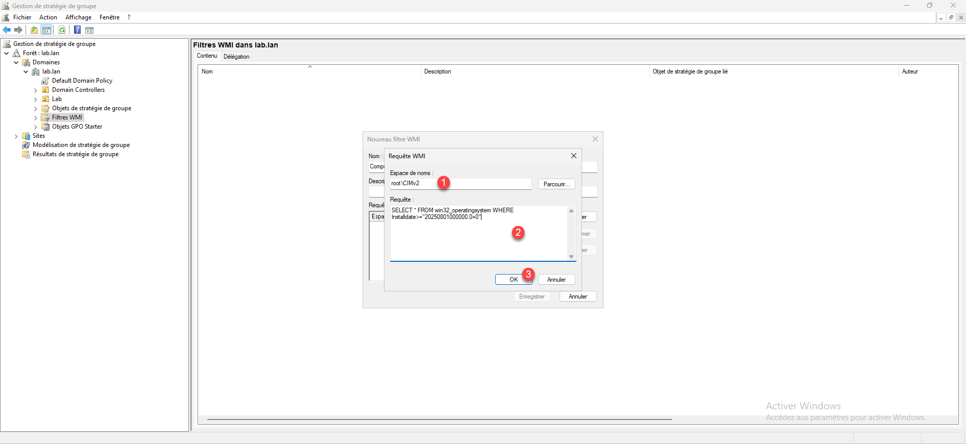 Espace de noms, sélectionner root\CIMv2 1, puis dans le champ Requêtes 2 mettre la ligne ci-dessous pour filtrer la date d’installation, dans le tutoriel la date est après le 01/08/2025, puis cliquer sur OK 3 pour ajouter la requête.