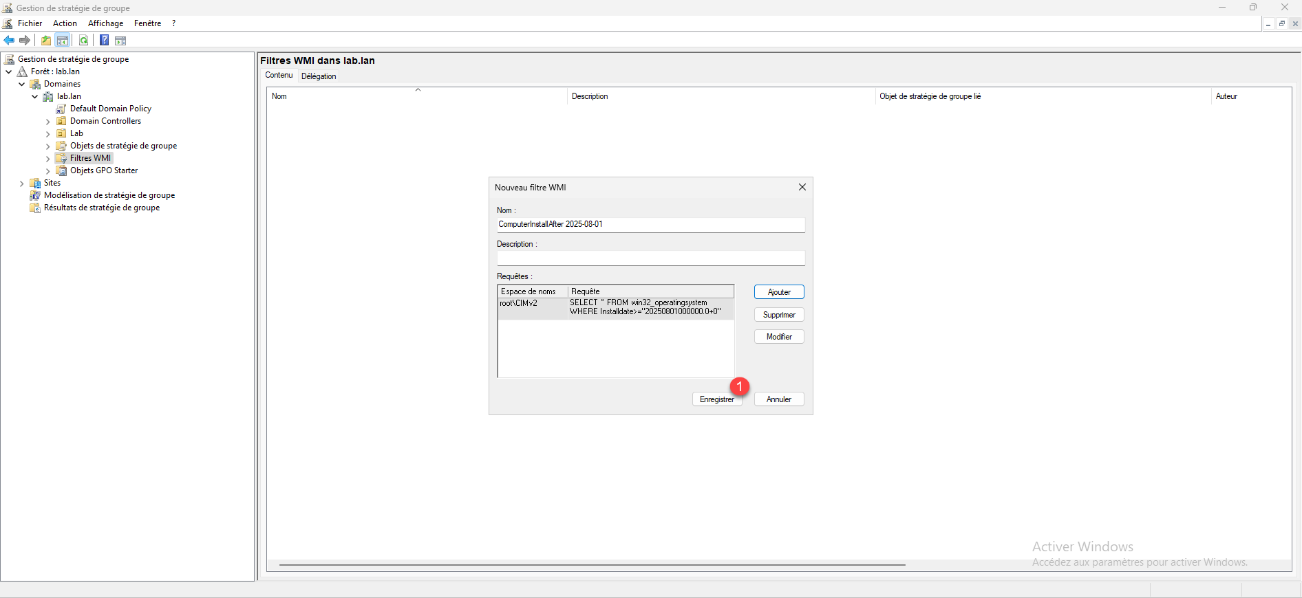 La requête est ajoutée, cliquer sur Enregistrer 1 pour enregistrer le filtre WMI.