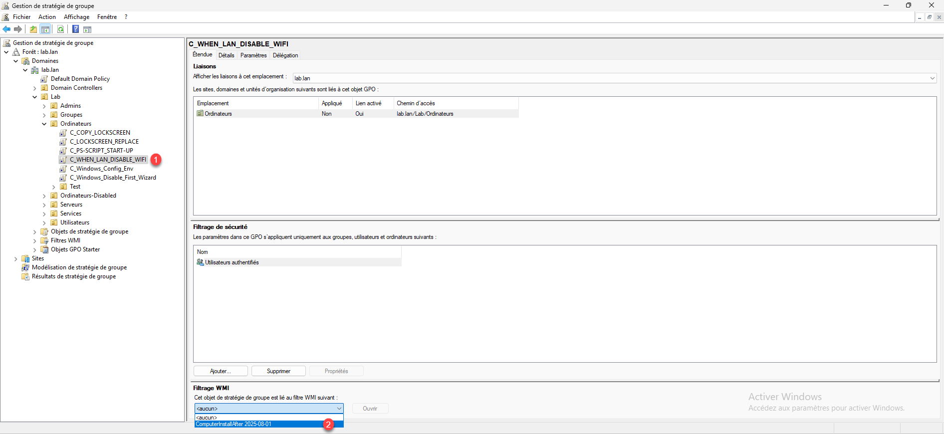 Sélectionner la stratégie de groupe 1 où vous souhaitez mettre le filtre et sélectionner le filtre WMI 2 dans la section Filtrage WMI.