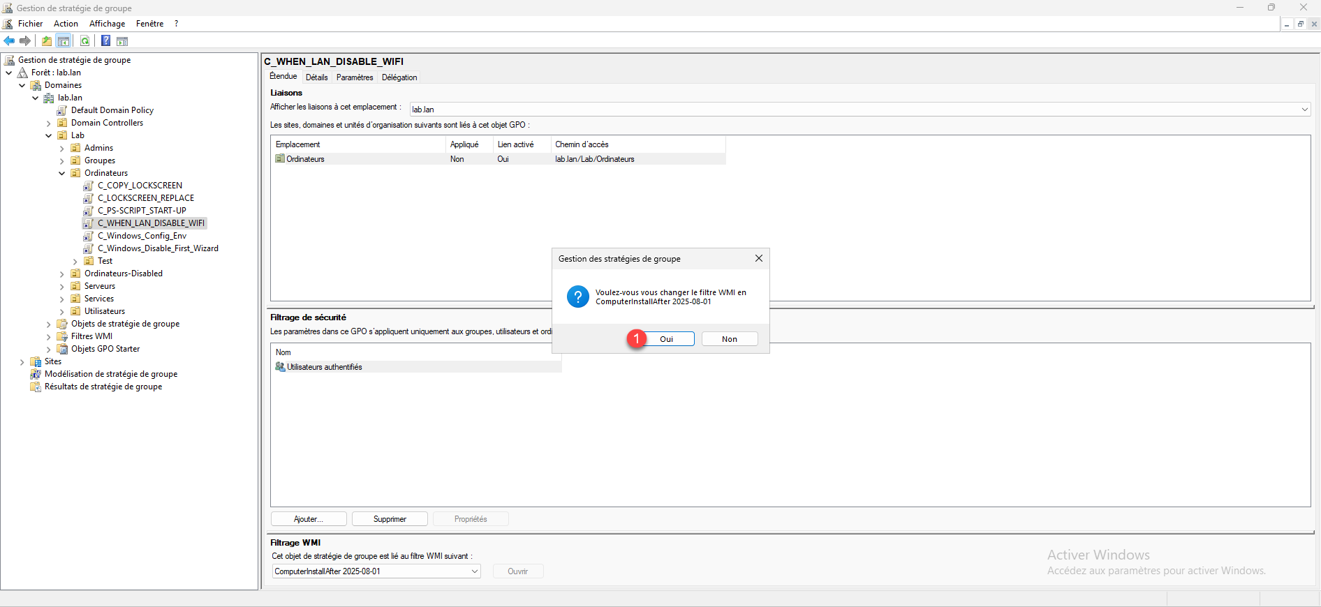 Confirmer l’ajout du filtre WMI en cliquant sur Oui 1.