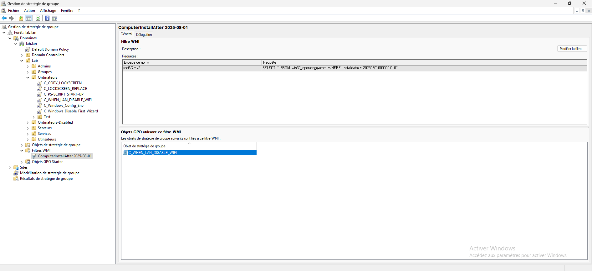 Dans ce tutoriel, je vais vous expliquer comment créer un filtre WMI pour appliquer une ou plusieurs stratégies de groupe (GPO) en fonction de la date d’installation du système d’exploitation Windows.