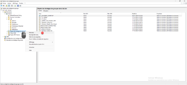 On va commencer par créer une stratégie de groupe, qui va copier le fichier sur les ordinateurs, depuis la console Gestion de stratégie de groupe, faire un clic droit sur Objets de stratégie de groupe puis cliquer sur Nouveau 1.