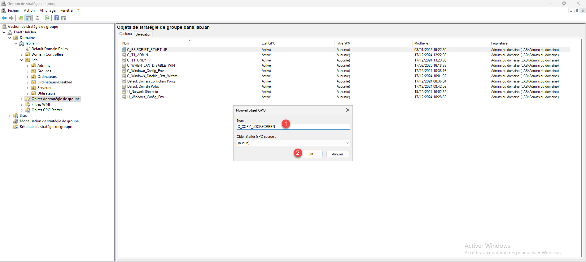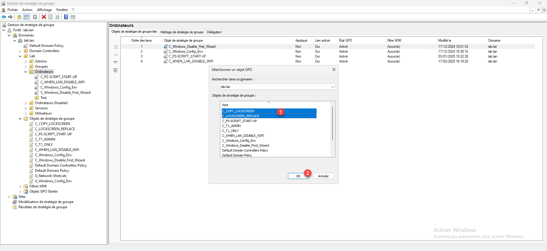 Je lie après l’objet GPO à l’OU mais vous pouvez le faire dès maintenant si vous le souhaitez.
