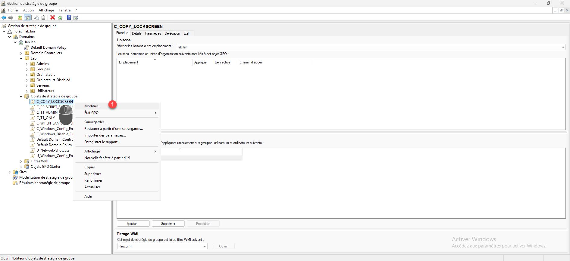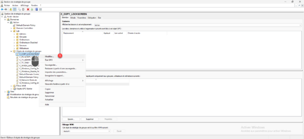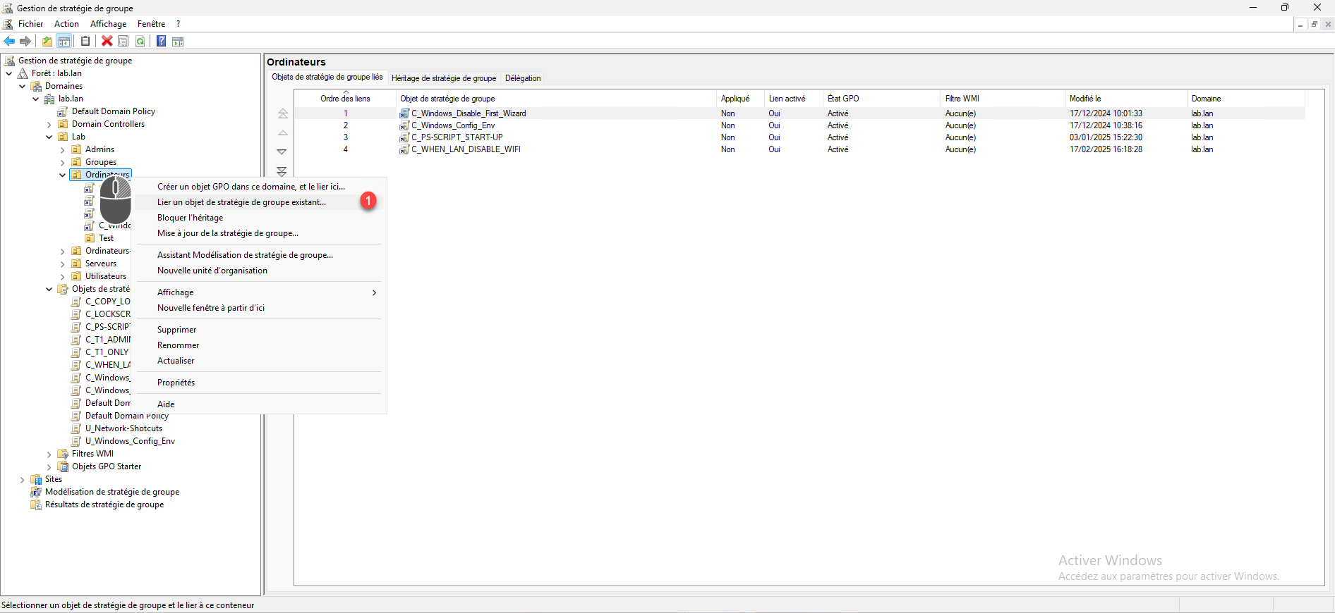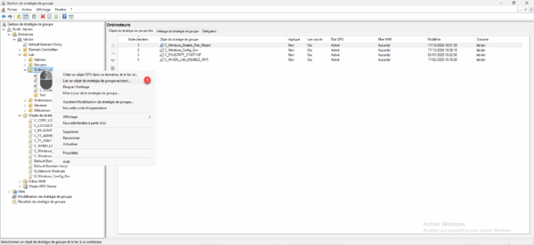 Faire un clic droit à l’emplacement souhaite, puis cliquer sur Lier un objet de stratégie de groupe existant 1.