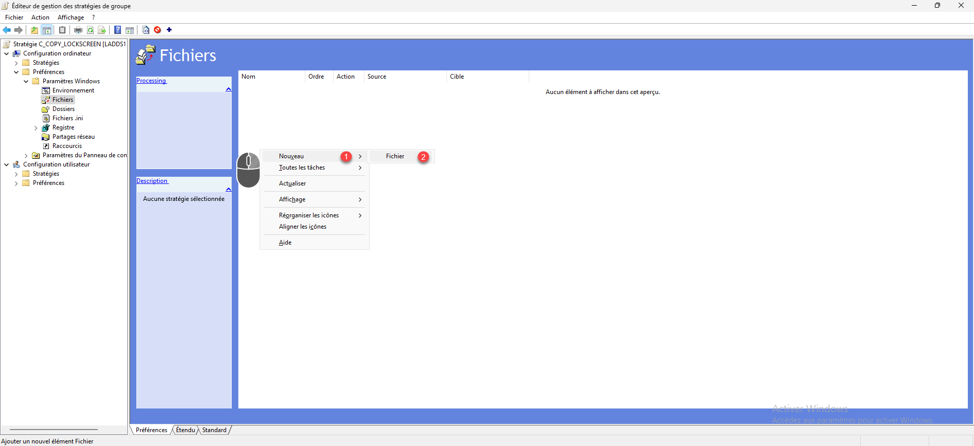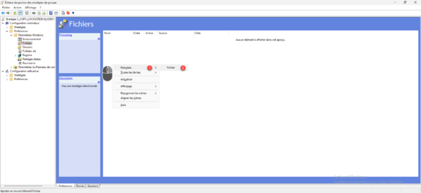 Aller à l’emplacement suivant : Configuration ordinateur / Préférences / Paramètres Windows / Fichiers, dans la zone centrale, faire un clic droit puis aller sur Nouveau 1 et cliquer sur Fichier 2.