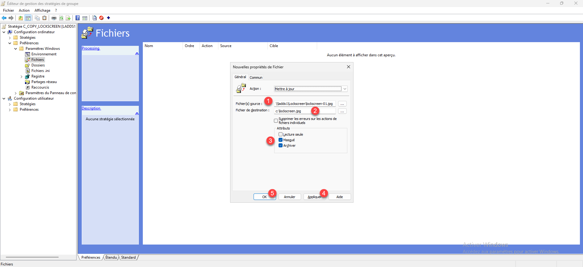 Indiquer le chemin UNC du fichier 1, puis l’emplacement de destination avec le nom du fichier 2, configurer les attributs 3 puis cliquer sur les boutons Appliquer 4 et OK 5.