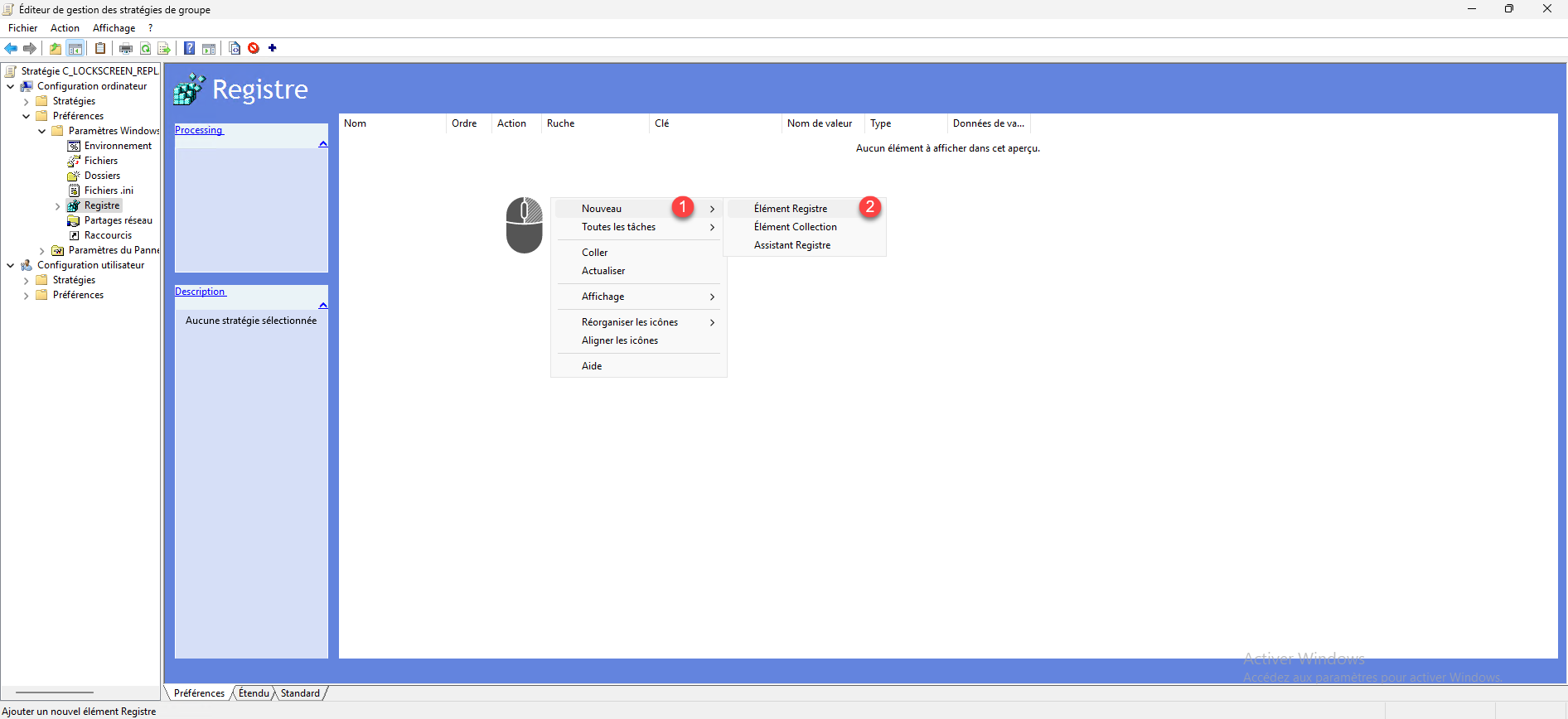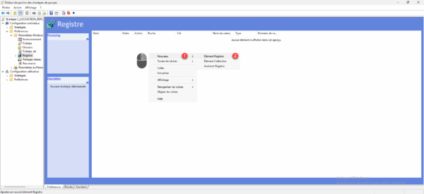 Pour créer une clé de registre, faire un clic droit dans la zone centrale, puis aller sur Nouveau 1 puis cliquer sur Elément Registre 2.