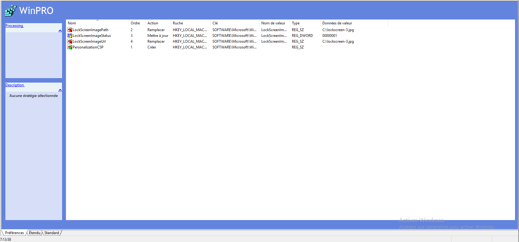 | Créer | HKEY_LOCAL_MACHINE | SOFTWARE\Microsoft\Windows\CurrentVersion\PersonalizationCSP | Cocher : Par défaut | REG_SZ | Vide | 1 |
