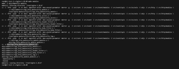 make modulesLe module ModSecurity pour Nginx est compilé, le fichier (ngx_http_modsecurity_module.so) est disponible se trouve dans le dossier obj.