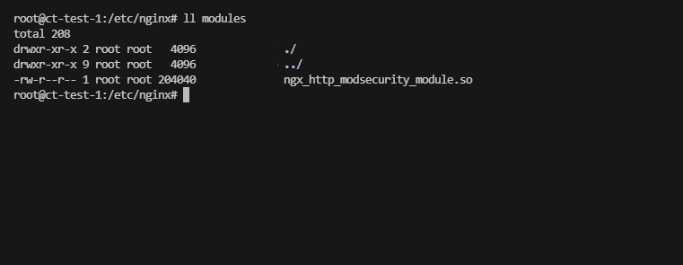 apt install libmodsecurity3t64 -yEnsuite dans le dossier /etc/nginx créer un dossier modules dans lequel on va mettre le fichier ngx_http_modsecurity_module.so.