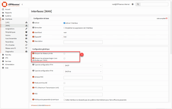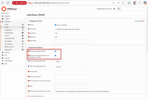 Cette option est indispensable lorsque le pare-feu est installé derrière une box opérateur ou un autre routeur, afin d’éviter le blocage par défaut du WAN. Vous pouvez ainsi déployer OPNsense dans ce type d’architecture sans rencontrer d’erreurs liées à l’utilisation d’adresses privées.