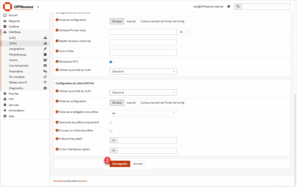 Depuis l’interface Web du Pare-feu, aller sur Interface / [WAN], qui permet d’afficher la configuration de celle-ci.