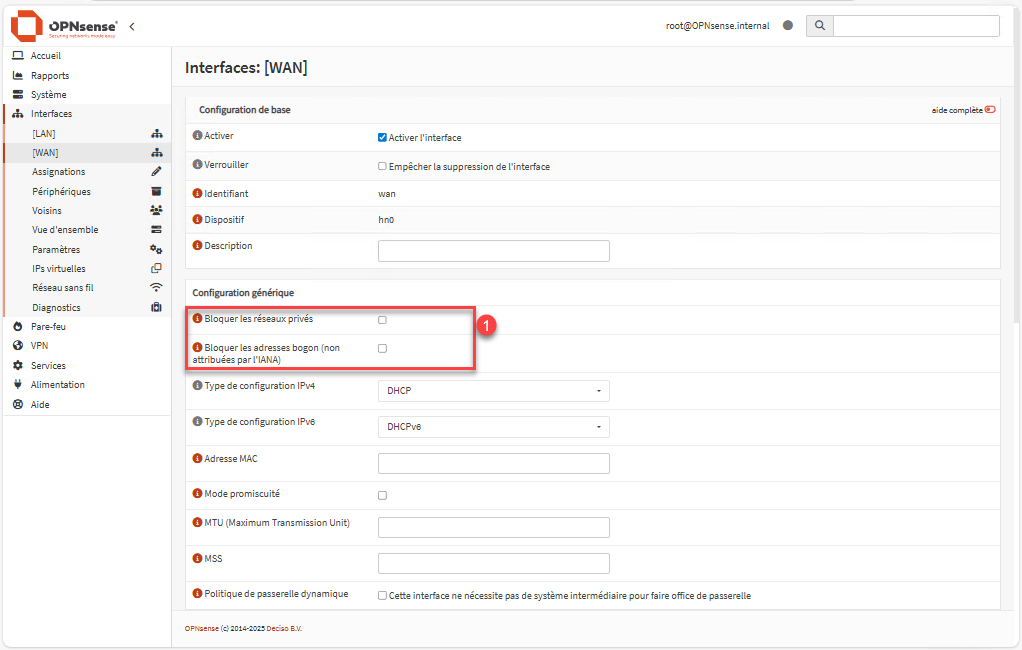 Cette option est indispensable lorsque le pare-feu est installé derrière une box opérateur ou un autre routeur, afin d’éviter le blocage par défaut du WAN. Vous pouvez ainsi déployer OPNsense dans ce type d’architecture sans rencontrer d’erreurs liées à l’utilisation d’adresses privées.