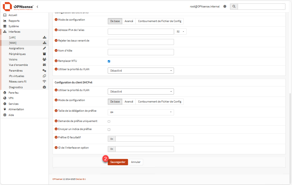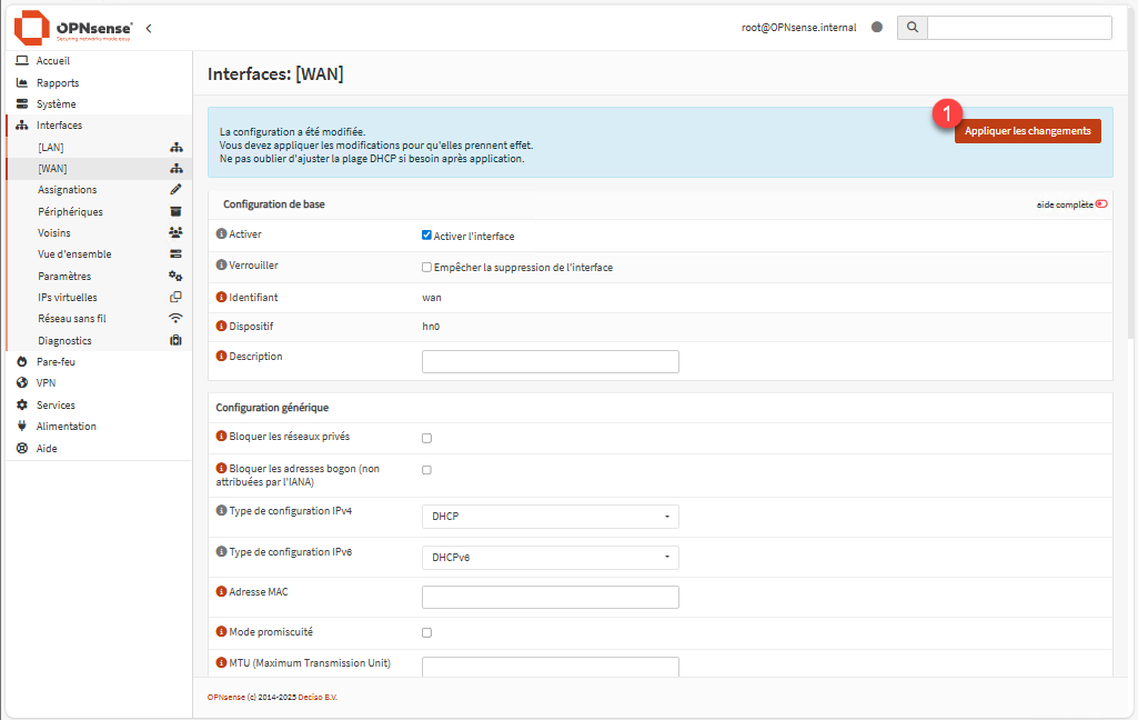 Depuis l’interface Web du Pare-feu, aller sur Interface / [WAN], qui permet d’afficher la configuration de celle-ci.