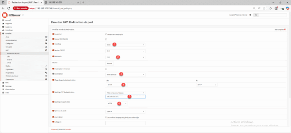 Sélectionner l’interface WAN 1, sélectionner le protocole 2 (pour ma part TCP), en destination choisir WAN Adresse <3 (qui sera l’adresse IP sur mon interface WAN), sélectionner le port 4 (je vais sélectionner HTTP), ensuite configurer le serveur de redirection 5 et le port 6. Pour finir cliquer sur sauvegarder 7 qui se trouve en bas de la page.