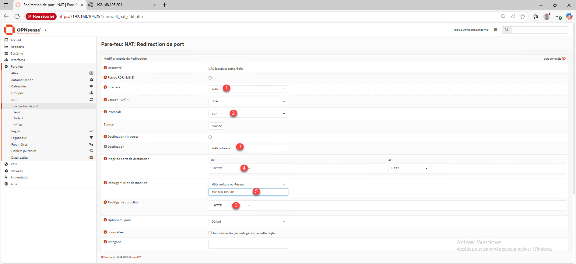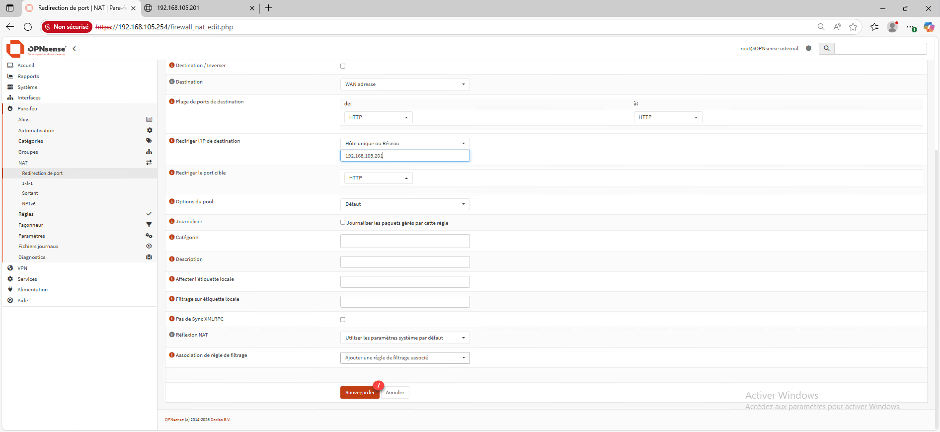 Sélectionner l’interface WAN 1, sélectionner le protocole 2 (pour ma part TCP), en destination choisir WAN Adresse <3 (qui sera l’adresse IP sur mon interface WAN), sélectionner le port 4 (je vais sélectionner HTTP), ensuite configurer le serveur de redirection 5 et le port 6. Pour finir cliquer sur sauvegarder 7 qui se trouve en bas de la page.