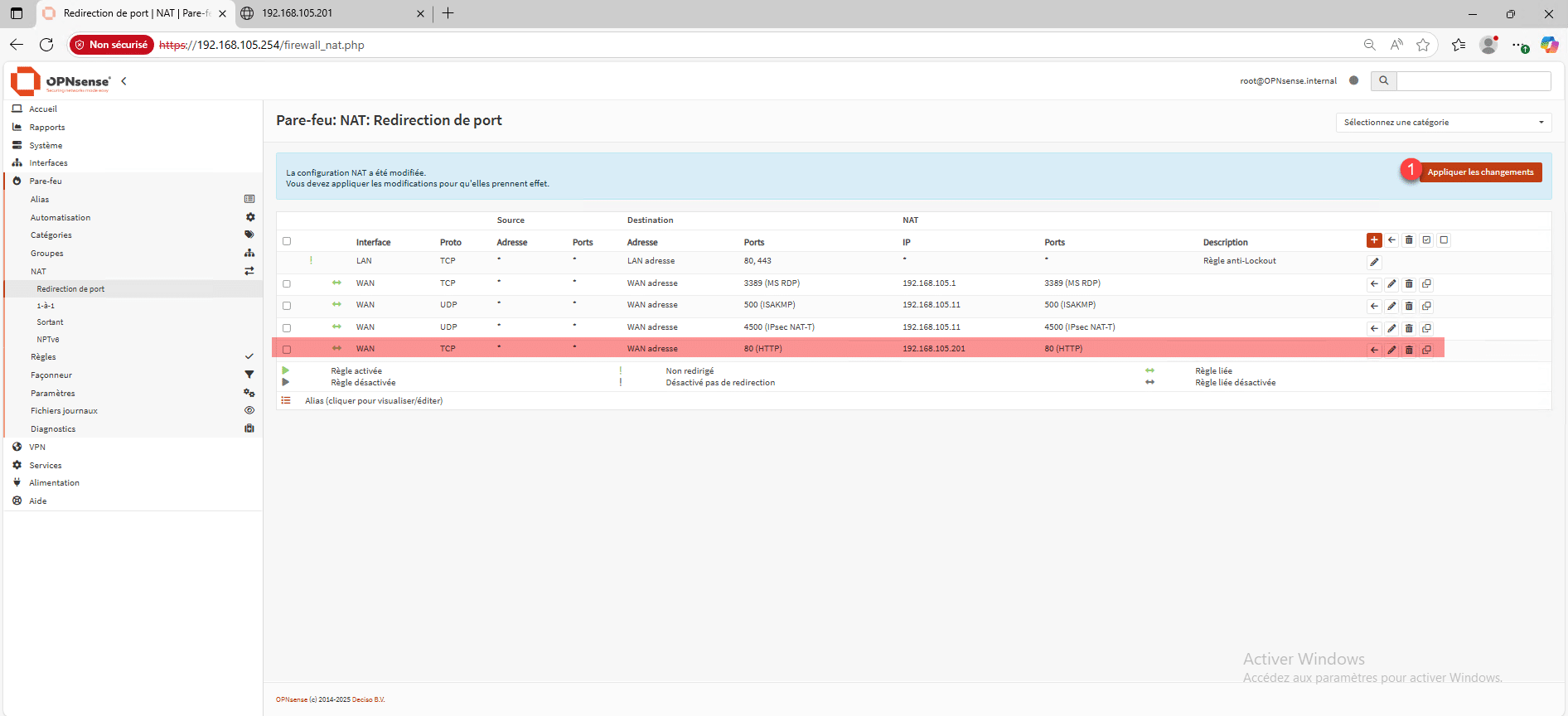 La règle est ajoutée, cliquer sur le bouton Appliquer les changements pour la prise en compte 1.