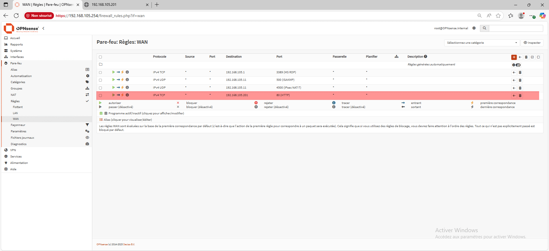 Au passage, dans la partie Règles dans la section WAN, on peut voir qu’une règle a aussi été créé pour autoriser le trafic sur le port 80.