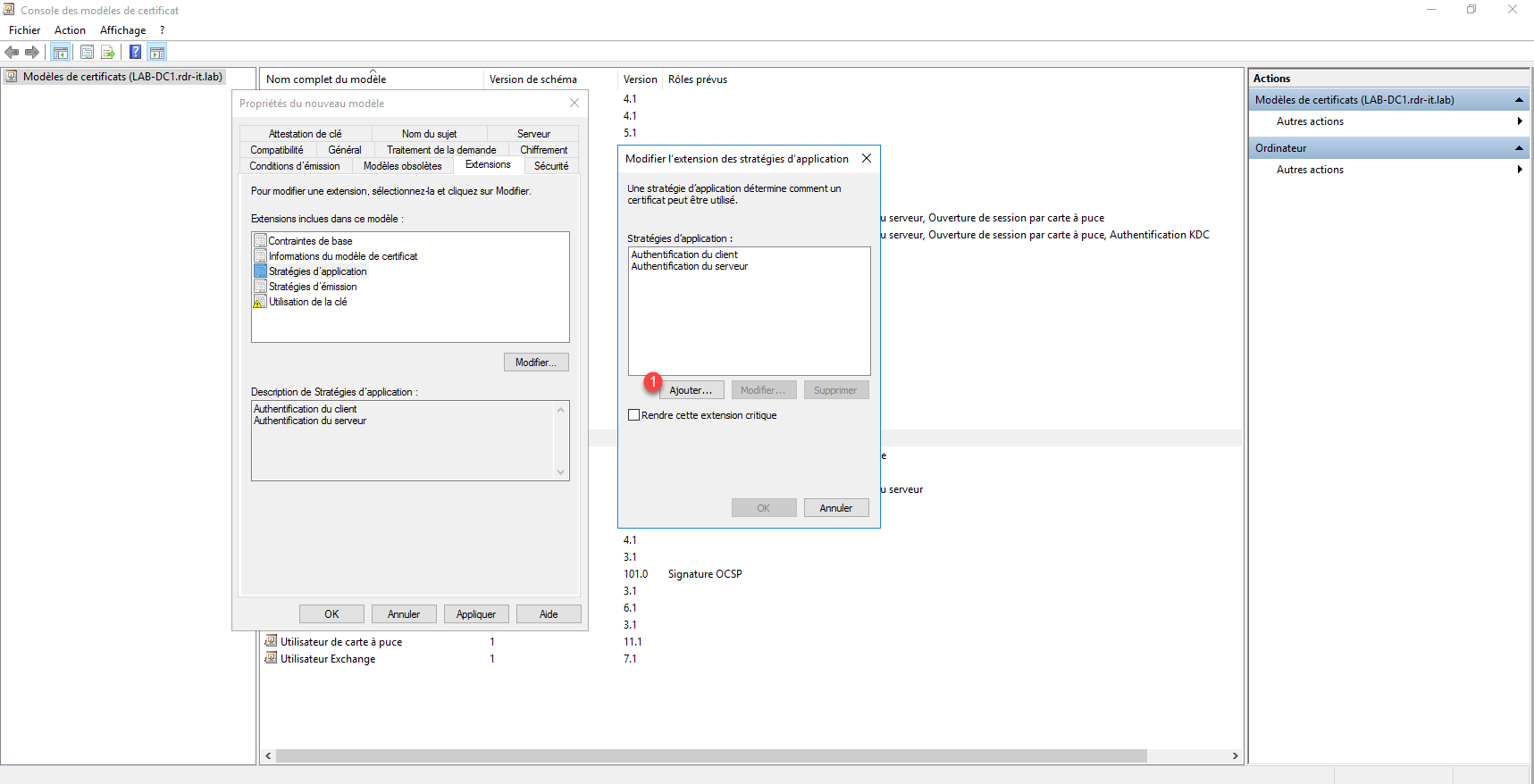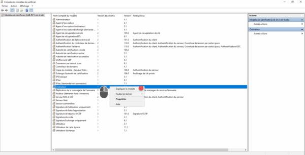 Nous allons utiliser le modèle ordinateur pour les certificats RDP, faire un clic droit sur le modèle Ordinateur et cliquer sur Dupliquer le modèle 1.