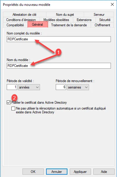 Aller sur l’onglet Général, nommer le certificat 1 puis cocher la case Publier le certificat dans Active Directory 2.