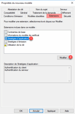 Aller sur l’onglet Extensions, sélectionner Stratégies d’application 1 et cliquer sur le bouton Modifier 2.