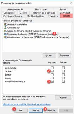 Aller maintenant sur l’onglet Sécurité, sélectionner Ordinateur du domaine 1 et cocher les cases Lecture 2 puis Inscription automatique 3. Terminer la création du modèle en cliquant sur les bouton Appliquer 4 et OK 5.