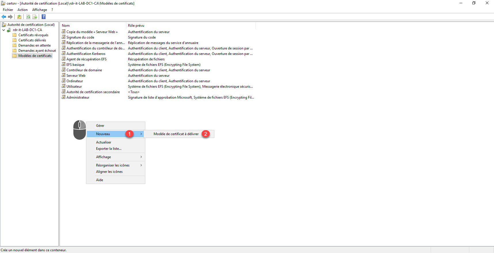 De retour sur la console de l’autorité de certification AD CS, dans la zone centrale Modèles de certificats, faire un clic droit, aller sur Nouveau 1 puis sur Modèle de certificat à délivrer 2.