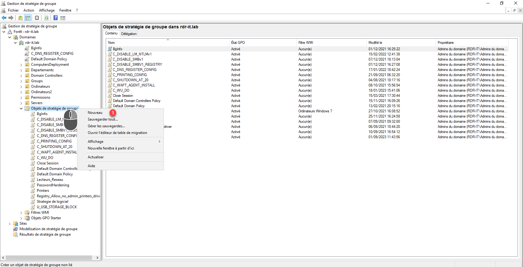 Depuis la console Gestion de stratégie de groupe, faire un clic droit sur Objets de stratégie de groupe et cliquer sur Nouveau 1.