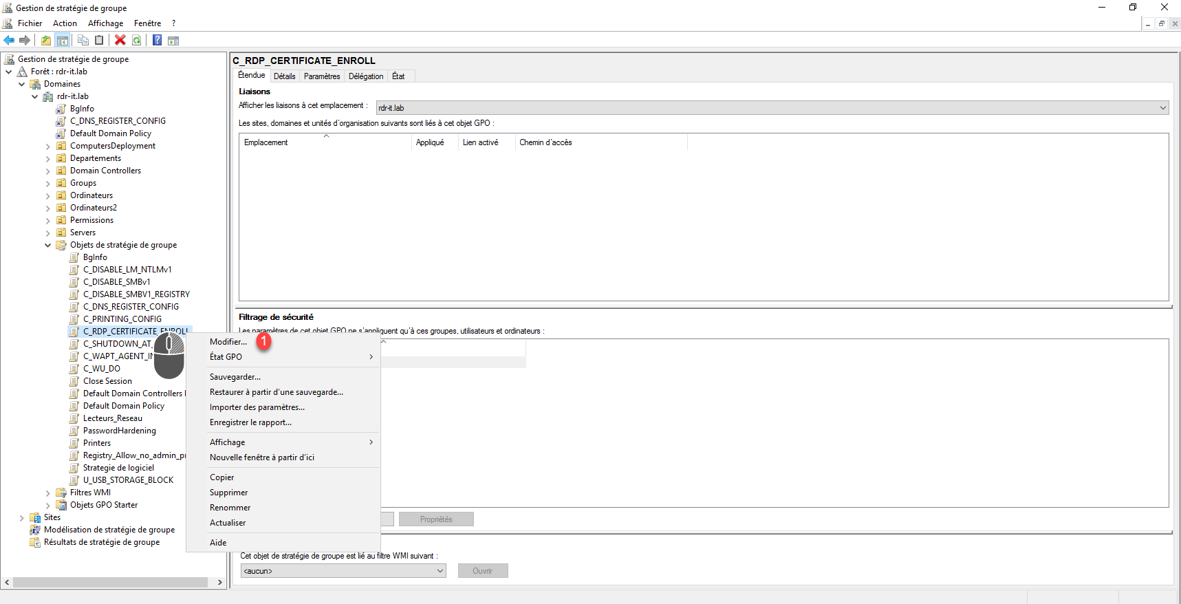 Faire un clic droit sur la GPO que l’on vient de créer et cliquer sur Modifier 1.
