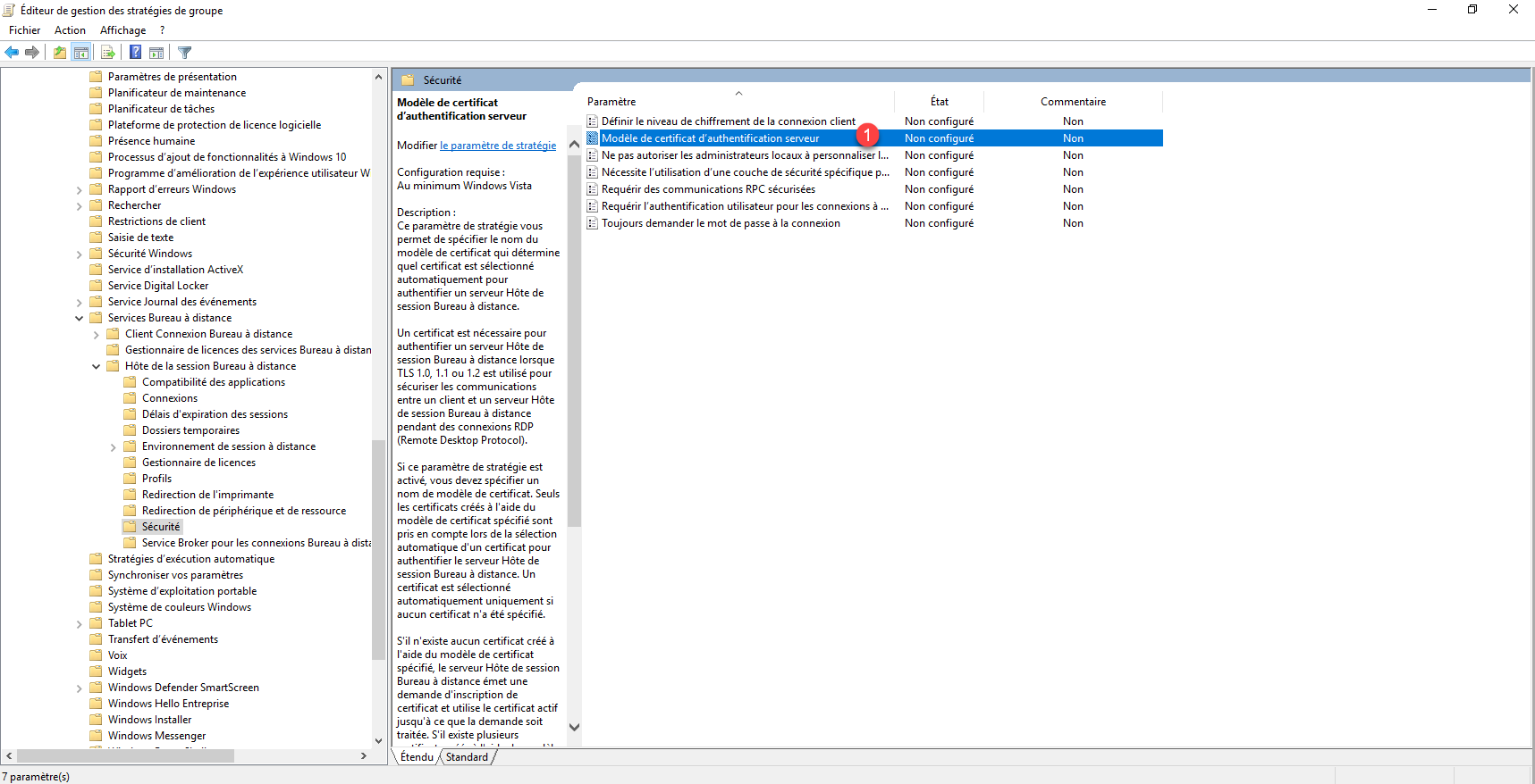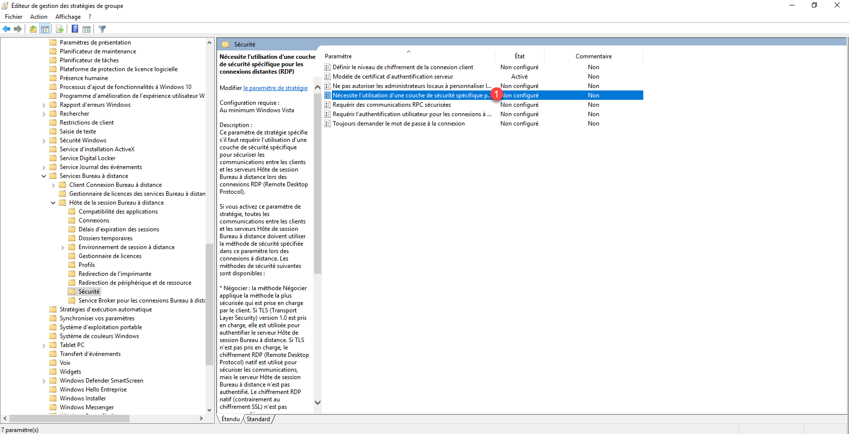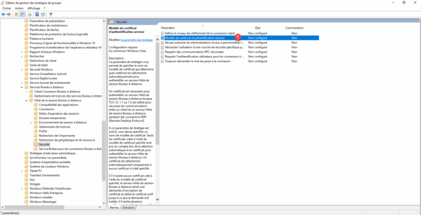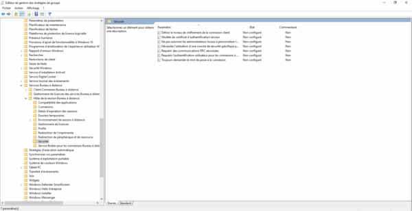 Aller à l’emplacement suivant : Configuration ordinateurs / Stratégies / Modèles d’administration / Composant Windows / Services Bureau à distance / Hôte de la session Bureau à distance / Sécurité.